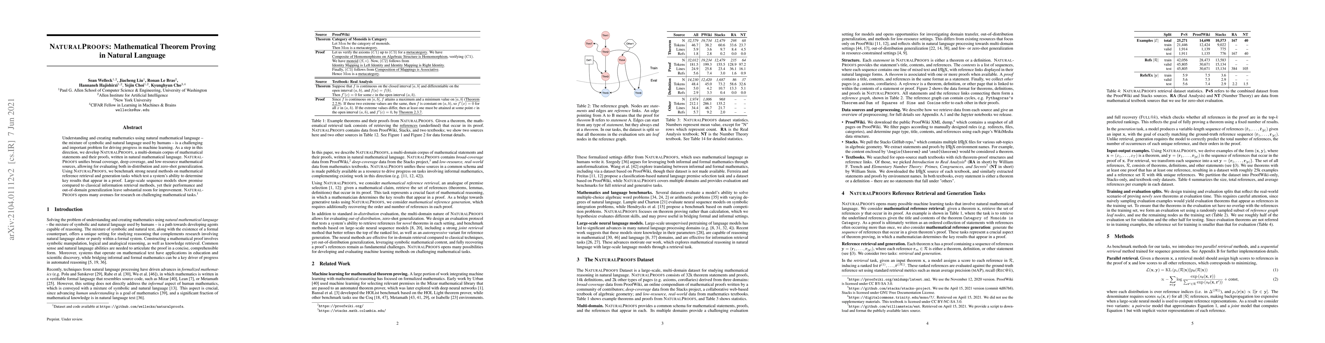 NaturalProofs, a multi-domain corpus of mathematical statements and proofs in natural mathematical language, enabling evaluation of both in-distribution and zero-shot generalization.