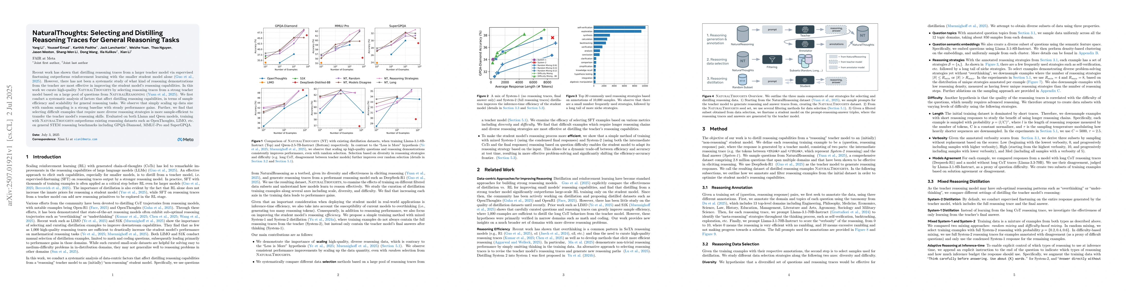 Recent work has shown that distilling reasoning traces from a larger teacher model via supervised finetuning outperforms reinforcement learning with the smaller student model alone (Guo et al. 2025). However, there has not been a systematic study of what kind of reasoning demonstrations from the teacher are most effective in improving the student model's reasoning capabilities. In this work we curate high-quality "NaturalThoughts" by selecting reasoning traces from a strong teacher model based on a large pool of questions from NaturalReasoning (Yuan et al. 2025). We first conduct a systematic analysis of factors that affect distilling reasoning capabilities, in terms of sample efficiency and scalability for general reasoning tasks. We observe that simply scaling up data size with random sampling is a strong baseline with steady performance gains. Further, we find that selecting difficult examples that require more diverse reasoning strategies is more sample-efficient to transfer the teacher model's reasoning skills. Evaluated on both Llama and Qwen models, training with NaturalThoughts outperforms existing reasoning datasets such as OpenThoughts, LIMO, etc. on general STEM reasoning benchmarks including GPQA-Diamond, MMLU-Pro and SuperGPQA.