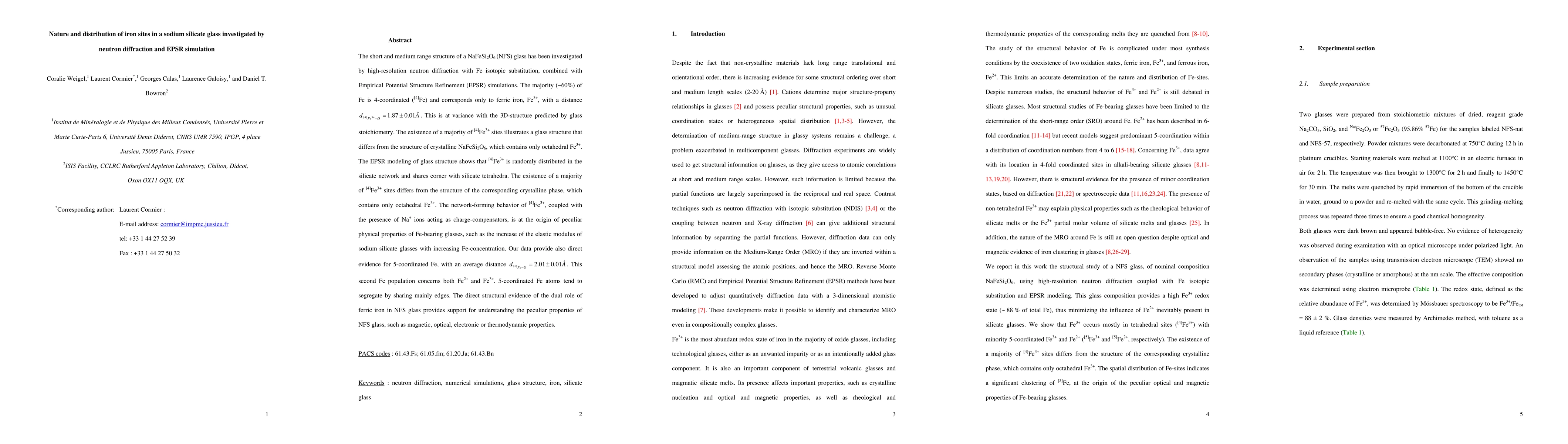 This study investigates the short and medium range structure of NaFeSi2O6 glass using neutron diffraction and EPSR simulations, revealing that ~60% of Fe is 4-coordinated ferric iron ([4]Fe3+) randomly distributed in the silicate network, contrasting with the octahedral Fe3+ in crystalline NaFeSi2O6. The findings also identify a 5-coordinated Fe population, both Fe2+ and Fe3+, which tends to segregate by edge-sharing.