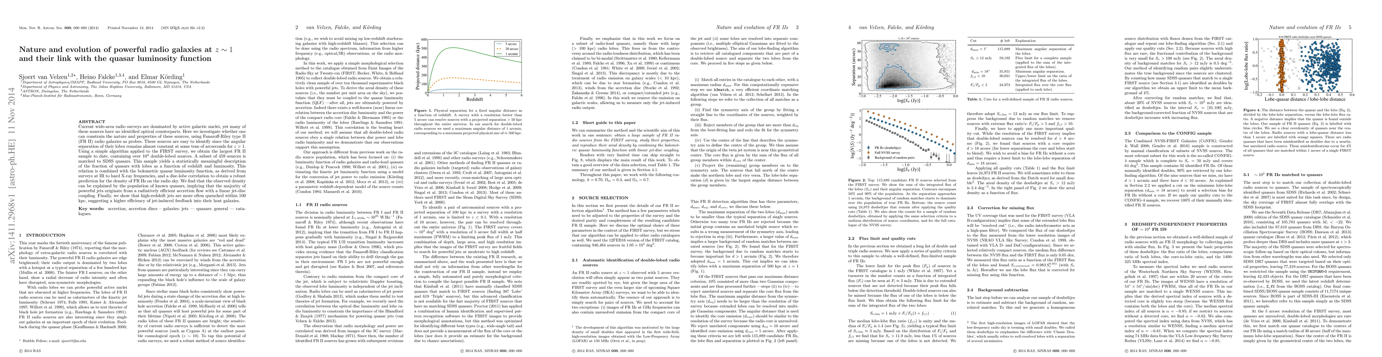 Current wide-area radio surveys are dominated by active galactic nuclei, yet many of these sources have no identified optical counterparts. Here we investigate whether one can constrain the nature and properties of these sources, using Fanaroff-Riley type II (FRII) radio galaxies as probes. These sources are easy to identify since the angular separation of their lobes remains almost constant at some tens of arcseconds for z>1. Using a simple algorithm applied to the FIRST survey, we obtain the largest FRII sample to date, containing over ten thousand double-lobed sources. A subset of 459 sources is matched to SDSS quasars. This sample yields a statistically meaningful description of the fraction of quasars with lobes as a function of redshift and luminosity. This relation is combined with the bolometric quasar luminosity function, as derived from surveys at IR to hard X-ray frequencies, and a disc-lobe correlation to obtain a robust prediction for the density of FRIIs on the radio sky. We find that the observed density can be explained by the population of known quasars, implying that the majority of powerful jets originate from a radiatively efficient accretion flow with a linear jet-disc coupling. Finally, we show that high-redshift jets are more often quenched within 100 kpc, suggesting a higher efficiency of jet-induced feedback into their host galaxies.