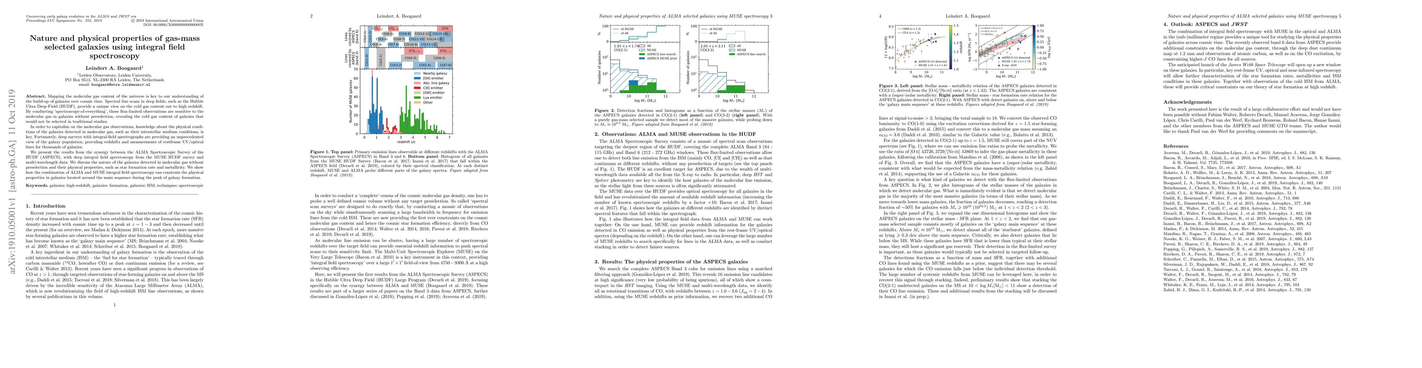 Mapping the molecular gas content of the universe is key to our understanding of the build-up of galaxies over cosmic time. Spectral line scans in deep fields, such as the Hubble Ultra Deep Field (HUDF), provide a unique view on the cold gas content out to high redshift. By conducting `spectroscopy-of-everything', these flux-limited observations are sensitive to the molecular gas in galaxies without preselection, revealing the cold gas content of galaxies that would not be selected in traditional studies. In order to capitalize on the molecular gas observations, knowledge about the physical conditions of the galaxies detected in molecular gas, such as their interstellar medium conditions, is key. Fortunately, deep surveys with integral-field spectrographs are providing an unprecedented view of the galaxy population, providing redshifts and measurements of restframe UV/optical lines for thousands of galaxies. We present the results from the synergy between the ALMA Spectroscopic Survey of the HUDF (ASPECS), with deep integral field spectroscopy from the MUSE HUDF survey and multi-wavelength data. We discuss the nature of the galaxies detected in molecular gas without preselection and their physical properties, such as star formation rate and metallicity. We show how the combination of ALMA and MUSE integral field spectroscopy can constrain the physical properties in galaxies located around the main sequence during the peak of galaxy formation.