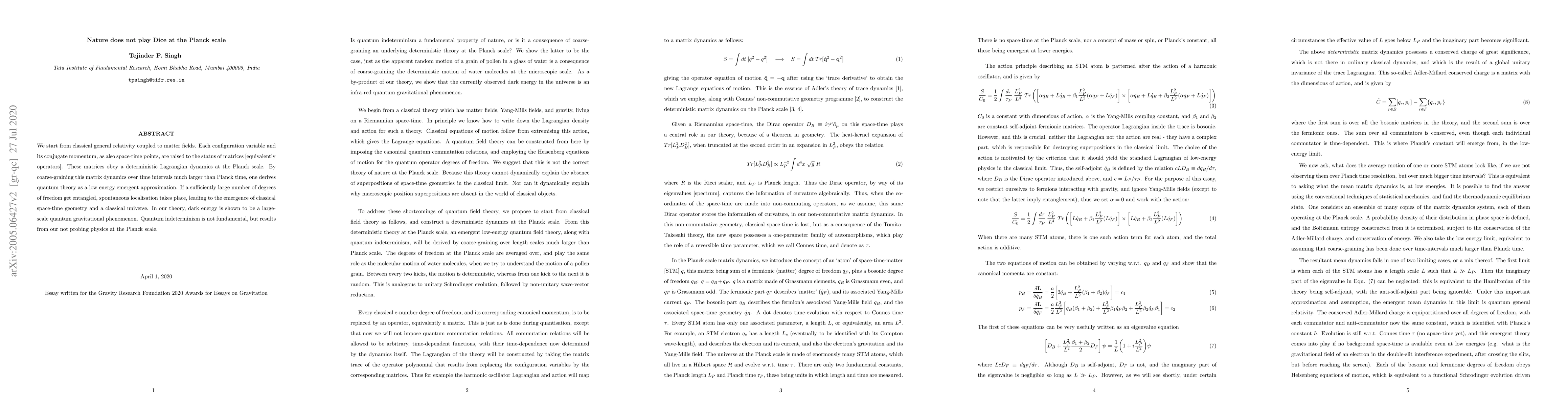 We start from classical general relativity coupled to matter fields. Each configuration variable and its conjugate momentum, as also space-time points, are raised to the status of matrices [equivalently operators]. These matrices obey a deterministic Lagrangian dynamics at the Planck scale. By coarse-graining this matrix dynamics over time intervals much larger than Planck time, one derives quantum theory as a low energy emergent approximation. If a sufficiently large number of degrees of freedom get entangled, spontaneous localisation takes place, leading to the emergence of classical space-time geometry and a classical universe. In our theory, dark energy is shown to be a large-scale quantum gravitational phenomenon. Quantum indeterminism is not fundamental, but results from our not probing physics at the Planck scale.