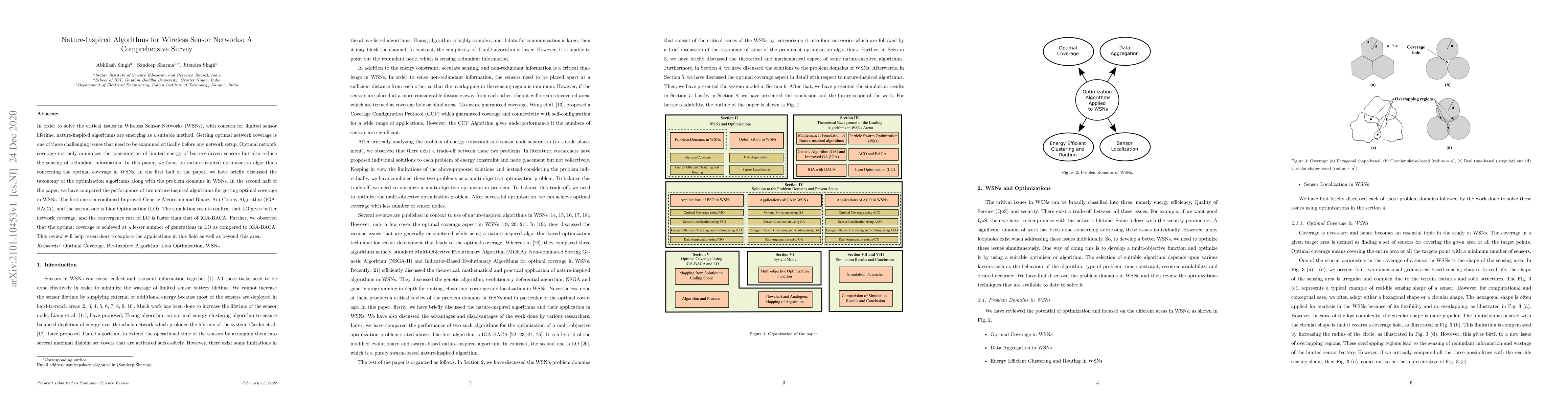 In order to solve the critical issues in Wireless Sensor Networks (WSNs), with concern for limited sensor lifetime, nature-inspired algorithms are emerging as a suitable method. Getting optimal network coverage is one of those challenging issues that need to be examined critically before any network setup. Optimal network coverage not only minimizes the consumption of limited energy of battery-driven sensors but also reduce the sensing of redundant information. In this paper, we focus on nature-inspired optimization algorithms concerning the optimal coverage in WSNs. In the first half of the paper, we have briefly discussed the taxonomy of the optimization algorithms along with the problem domains in WSNs. In the second half of the paper, we have compared the performance of two nature-inspired algorithms for getting optimal coverage in WSNs. The first one is a combined Improved Genetic Algorithm and Binary Ant Colony Algorithm (IGABACA), and the second one is Lion Optimization (LO). The simulation results confirm that LO gives better network coverage, and the convergence rate of LO is faster than that of IGA-BACA. Further, we observed that the optimal coverage is achieved at a lesser number of generations in LO as compared to IGA-BACA. This review will help researchers to explore the applications in this field as well as beyond this area. Keywords: Optimal Coverage, Bio-inspired Algorithm, Lion Optimization, WSNs.