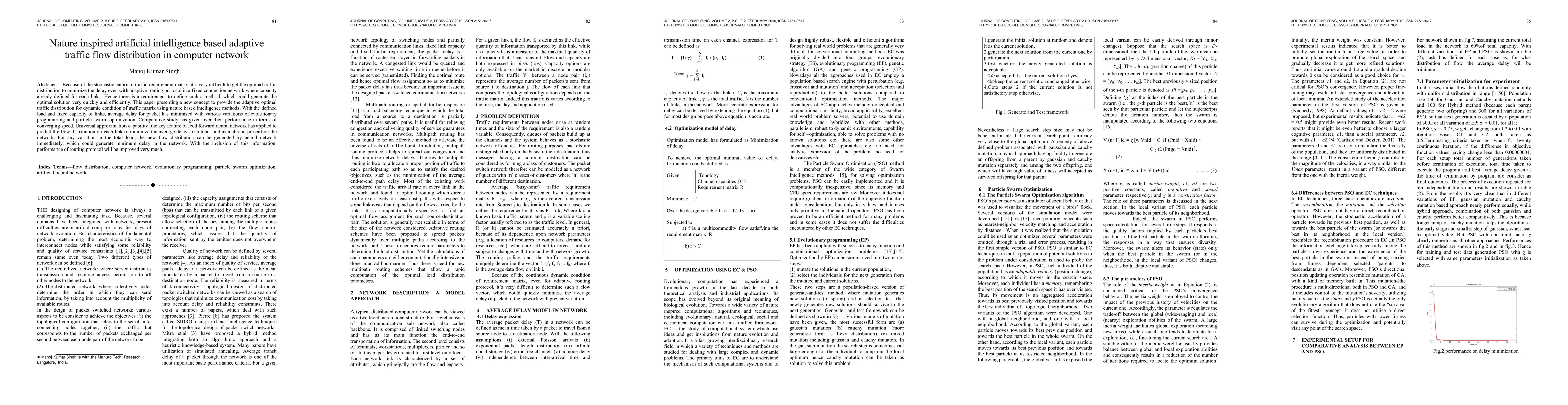 A new method using nature-inspired intelligence combines evolutionary programming and particle swarm optimization to optimize traffic flow in computer networks, reducing average delay with neural network prediction.