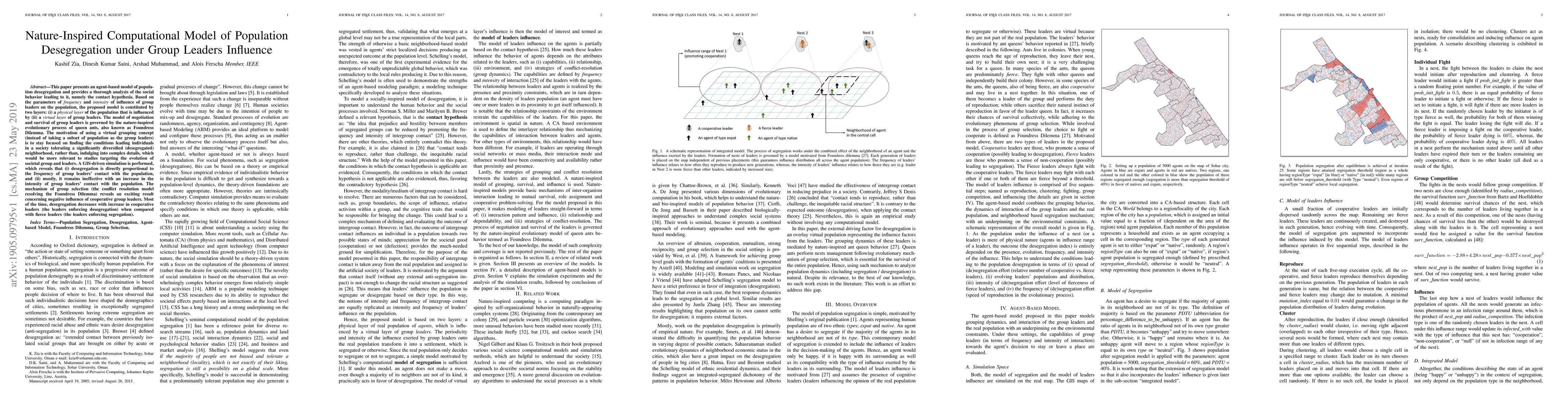 This paper presents an agent-based model of population desegregation and provides a thorough analysis of the social behavior leading to it, namely, the contact hypothesis. Based on the parameters of frequency and intensity of influence of group leaders on the population, the proposed model is constituted by two layers: 1) a physical layer of the population that is influenced by and 2) a virtual layer of group leaders. The model of negotiation and survival of group leaders are governed by the nature-inspired evolutionary process of queen ants, also known as Foundress Dilemma. The motivation of using a virtual grouping concept (instead of taking a subset of population as the group leaders) is to stay focused on finding the conditions leading individuals in a society tolerating a significantly diversified (desegregated) neighborhood, rather than, indulging into complex details, which would be more relevant to studies targeting the evolution of societal group and leaders. A geographic information system-driven simulation is performed, which reveals that: 1) desegregation is directly proportional to the frequency of group leaders' contact with the population and 2) mostly, it remains ineffective with an increase in the intensity of group leaders' contact with the population. The mechanism of group selection (the conflict resolution model resolving the Foundress Dilemma) reveals an exciting result concerning negative influence of cooperative group leaders. Most of the time, desegregation decreases with increase in cooperative leaders (the leaders enforcing desegregation) when compared with fierce leaders (the leaders enforcing segregation).