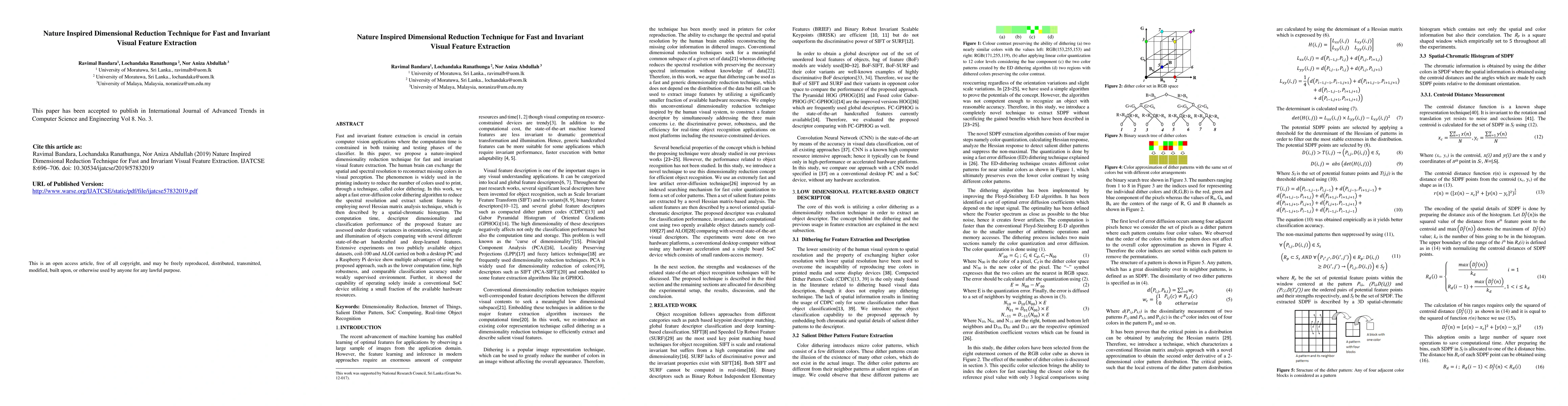 Fast and invariant feature extraction is crucial in certain computer vision applications where the computation time is constrained in both training and testing phases of the classifier. In this paper, we propose a nature-inspired dimensionality reduction technique for fast and invariant visual feature extraction. The human brain can exchange the spatial and spectral resolution to reconstruct missing colors in visual perception. The phenomenon is widely used in the printing industry to reduce the number of colors used to print, through a technique, called color dithering. In this work, we adopt a fast error-diffusion color dithering algorithm to reduce the spectral resolution and extract salient features by employing novel Hessian matrix analysis technique, which is then described by a spatial-chromatic histogram. The computation time, descriptor dimensionality and classification performance of the proposed feature are assessed under drastic variances in orientation, viewing angle and illumination of objects comparing with several different state-of-the-art handcrafted and deep-learned features. Extensive experiments on two publicly available object datasets, coil-100 and ALOI carried on both a desktop PC and a Raspberry Pi device show multiple advantages of using the proposed approach, such as the lower computation time, high robustness, and comparable classification accuracy under weakly supervised environment. Further, it showed the capability of operating solely inside a conventional SoC device utilizing a small fraction of the available hardware resources.