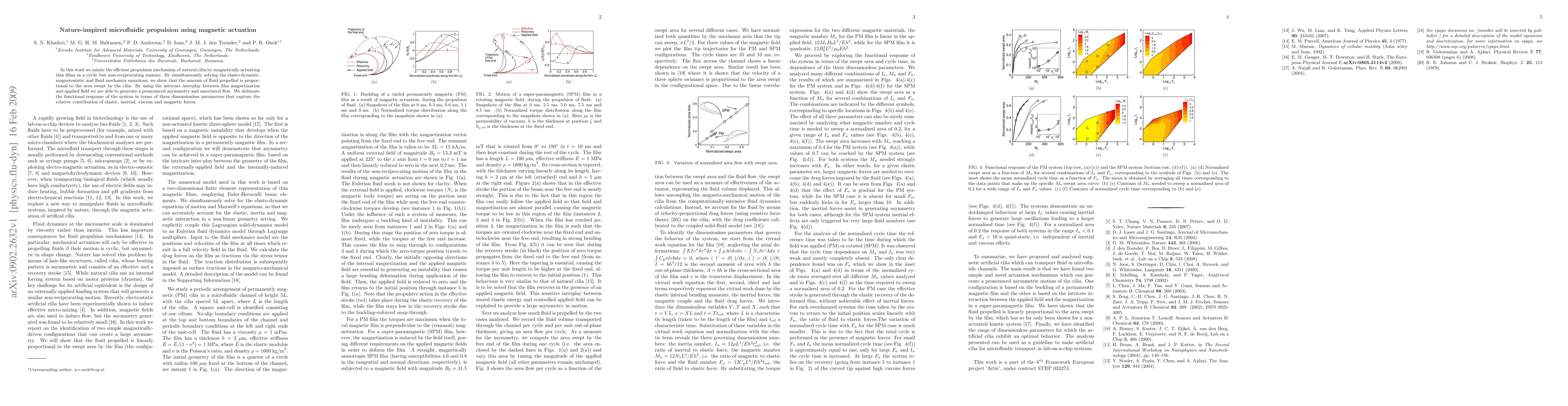 In this work we mimic the efficient propulsion mechanism of natural cilia by magnetically actuating thin films in a cyclic but non-reciprocating manner. By simultaneously solving the elasto-dynamic, magnetostatic and fluid mechanics equations, we show that the amount of fluid propelled is proportional to the area swept by the cilia. By using the intricate interplay between film magnetization and applied field we are able to generate a pronounced asymmetry and associated flow. We delineate the functional response of the system in terms of three dimensionless parameters that capture the relative contribution of elastic, inertial, viscous and magnetic forces.