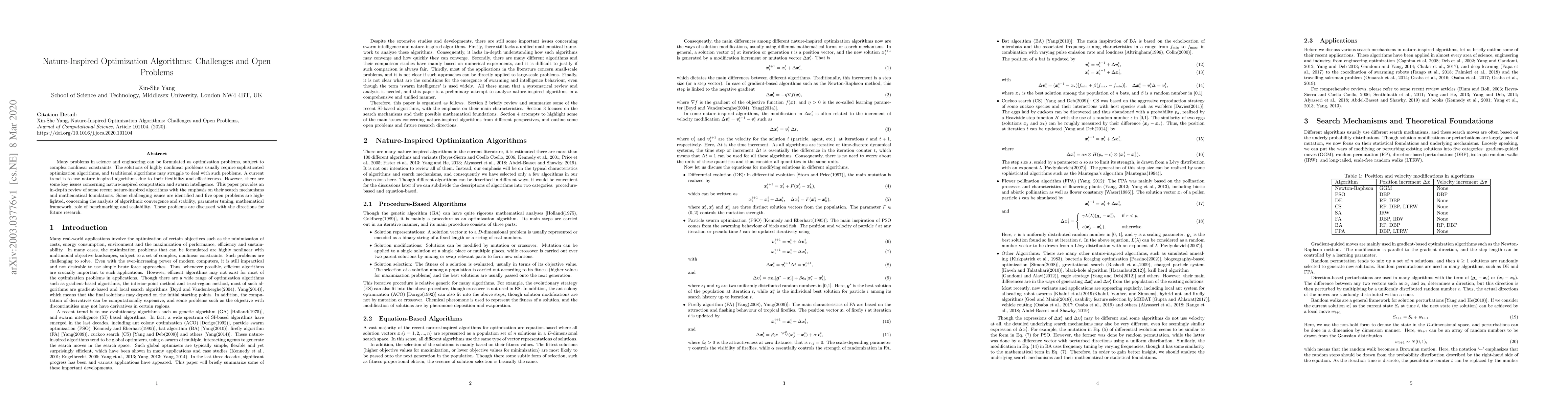 This paper reviews nature-inspired optimization algorithms, highlighting their effectiveness in solving complex nonlinear problems. It identifies key issues such as convergence analysis, parameter tuning, and scalability, proposing five open problems for future research in this field.