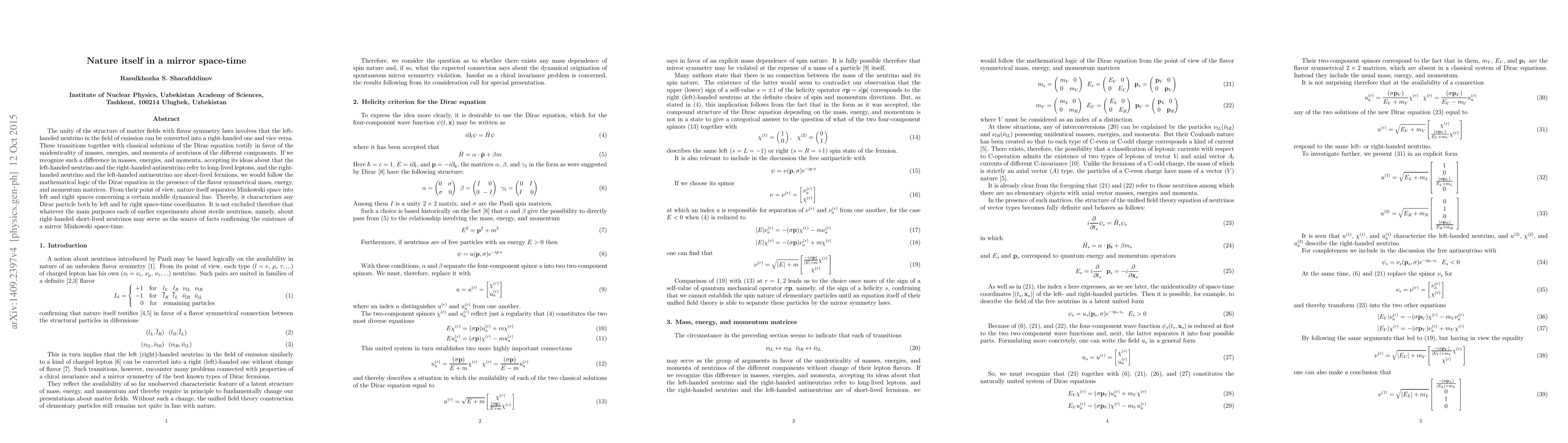 The unity of the structure of matter fields with flavor symmetry laws involves that the left-handed neutrino in the field of emission can be converted into a right-handed one and vice versa. These transitions together with classical solutions of the Dirac equation testify in favor of the unidenticality of masses, energies, and momenta of neutrinos of the different components. If we recognize such a difference in masses, energies, and momenta, accepting its ideas about that the left-handed neutrino and the right-handed antineutrino refer to long-lived leptons, and the right-handed neutrino and the left-handed antineutrino are short-lived fermions, we would follow the mathematical logic of the Dirac equation in the presence of the flavor symmetrical mass, energy, and momentum matrices. From their point of view, nature itself separates Minkowski space into left and right spaces concerning a certain middle dynamical line. Thereby, it characterizes any Dirac particle both by left and by right space-time coordinates. It is not excluded therefore that whatever the main purposes each of earlier experiments about sterile neutrinos, namely, about right-handed short-lived neutrinos may serve as the source of facts confirming the existence of a mirror Minkowski space-time.