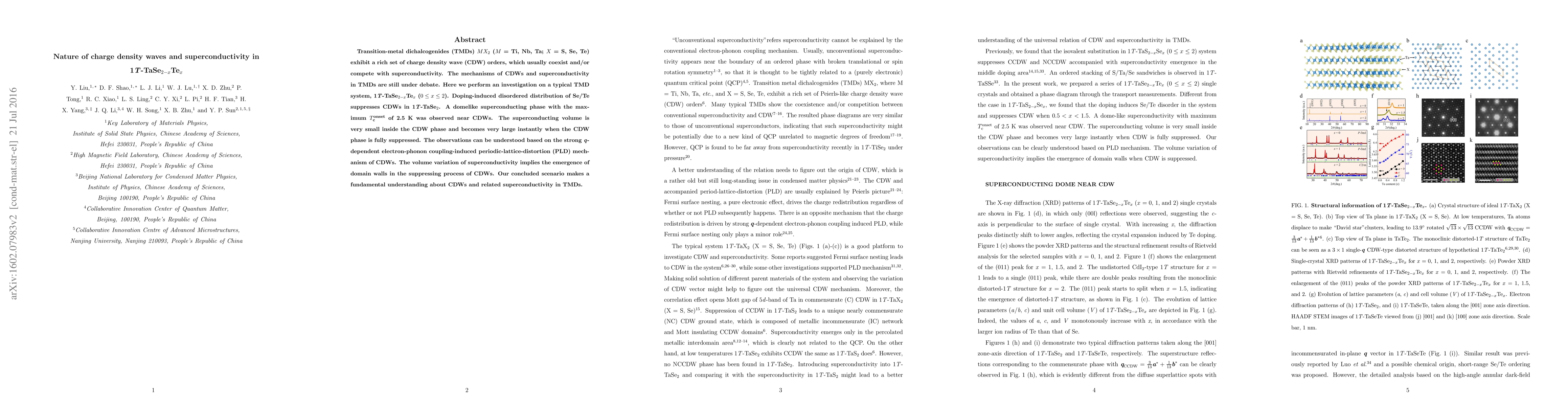 Transition-metal dichalcogenides (TMDs) $MX_2$ ($M$ = Ti, Nb, Ta; $X$ = S, Se, Te) exhibit a rich set of charge density wave (CDW) orders, which usually coexist and/or compete with superconductivity. The mechanisms of CDWs and superconductivity in TMDs are still under debate. Here we perform an investigation on a typical TMD system, 1\emph{T}-TaSe$_{2-x}$Te$_x$ ($0 \leq x \leq 2$). Doping-induced disordered distribution of Se/Te suppresses CDWs in 1\emph{T}-TaSe$_2$. A domelike superconducting phase with the maximum $T_\textrm{c}^{\textrm{onset}}$ of 2.5 K was observed near CDWs. The superconducting volume is very small inside the CDW phase and becomes very large instantly when the CDW phase is fully suppressed. The observations can be understood based on the strong \emph{\textbf{q}}-dependent electron-phonon coupling-induced periodic-lattice-distortion (PLD) mechanism of CDWs. The volume variation of superconductivity implies the emergence of domain walls in the suppressing process of CDWs. Our concluded scenario makes a fundamental understanding about CDWs and related superconductivity in TMDs.