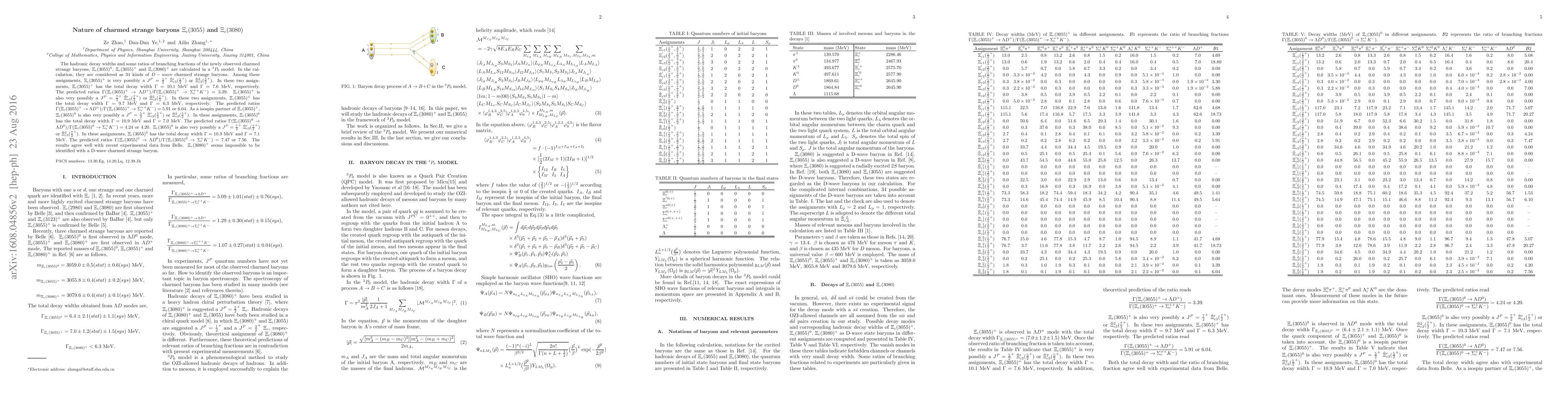 The hadronic decay widths and some ratios of branching fractions of the newly observed charmed strange baryons, $\Xi_c(3055)^0$, $\Xi_c(3055)^+$ and $\Xi_c(3080)^+$ are calculated in a $^3P_0$ model. In the calculation, they are considered as $34$ kinds of $D-wave$ charmed strange baryons. Among these assignments, $\Xi_c(3055)^+$ is very possibly a $J^P={5\over 2}^+$ $\hat\Xi_{c3}^\prime(\frac{5}{2}^+)$ or $\check\Xi_{c3}^2(\frac{5}{2}^+)$, where $\Xi_c(3055)^+$ has the total decay width $\Gamma=10.1$ MeV and $\Gamma=7.6$ MeV. The predicted ratios $\Gamma(\Xi_c(3055)^+ \to \Lambda D^+ )/ \Gamma(\Xi_c(3055)^+ \to \Sigma_c^{++}K^-)=3.39$. $\Xi_c(3055)^+$ is also very possibly a $J^P={7\over 2}^+$ $\hat\Xi_{c3}^\prime(\frac{7}{2}^+)$ or $\check\Xi_{c3}^2(\frac{7}{2}^+)$. In these two assignments, $\Xi_c(3055)^+$ has the total decay width $\Gamma=9.7$ MeV and $\Gamma=6.3$ MeV. The predicted ratios $\Gamma(\Xi_c(3055)^+ \to \Lambda D^+ )/ \Gamma(\Xi_c(3055)^+ \to \Sigma_c^{++}K^-)=5.91~\rm{or}~6.04$. As a isospin partner of $\Xi_c(3055)^+$, $\Xi_c(3055)^0$ is also very possibly a $J^P={5\over 2}^+$ $\hat\Xi_{c3}^\prime(\frac{5}{2}^+)$ or $\check\Xi_{c3}^2(\frac{5}{2}^+)$, where $\Xi_c(3055)^0$ has the total decay width $\Gamma=10.9$ MeV and $\Gamma=7.0$ MeV. The predicted ratios $\Gamma(\Xi_c(3055)^0 \to \Lambda D^0 )/ \Gamma(\Xi_c(3055)^0 \to \Sigma_c^{+}K^-)=4.24~\rm{or}~4.20$. $\Xi_c(3055)^0$ is also very possibly a $J^P={7\over 2}^+$ $\hat\Xi_{c3}^\prime(\frac{7}{2}^+)$ or $\check\Xi_{c3}^2(\frac{7}{2}^+)$. In these assignments, $\Xi_c(3055)^0$ has the total decay width $\Gamma=10.3$ MeV and $\Gamma=7.1$ MeV. The predicted ratios $\Gamma(\Xi_c(3055)^0 \to \Lambda D^0 )/ \Gamma(\Xi_c(3055)^0 \to \Sigma_c^{+}K^-)=7.47~\rm{or}~7.56$. The results agree well with recent experimental data from Belle. $\Xi_c(3080)^+$ seems impossible to be identified with a D-wave charmed strange baryon.