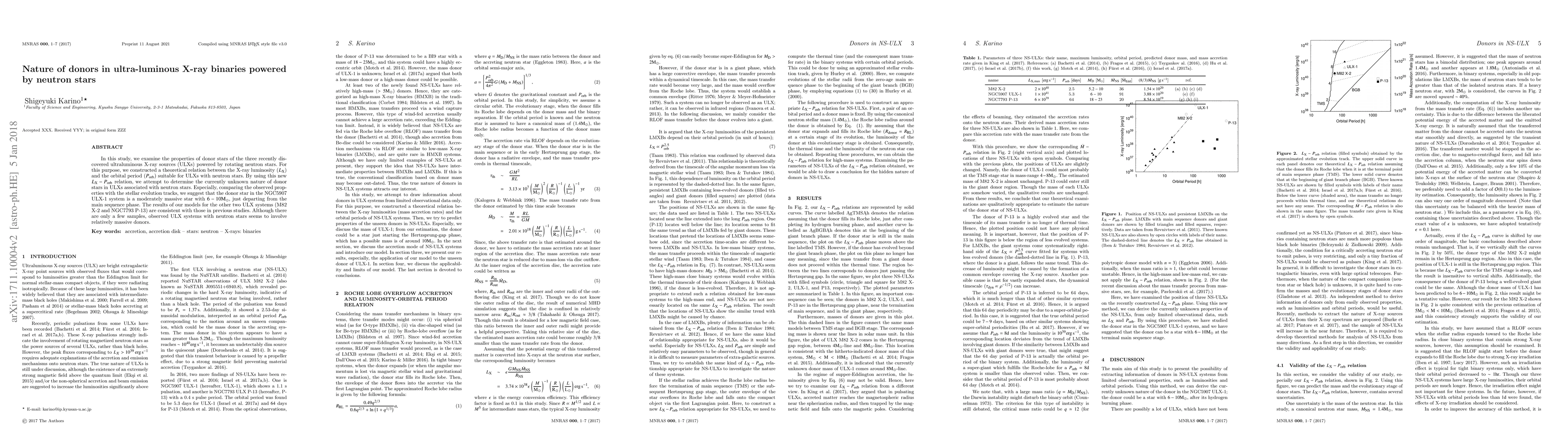 This study investigates the nature of donor stars in three ultra-luminous X-ray binaries powered by neutron stars, proposing a theoretical relation between X-ray luminosity and orbital period. The analysis suggests that the donor star in NGC5907 ULX-1 is a moderately massive star transitioning from the main sequence, while the other two systems align with previous findings.
