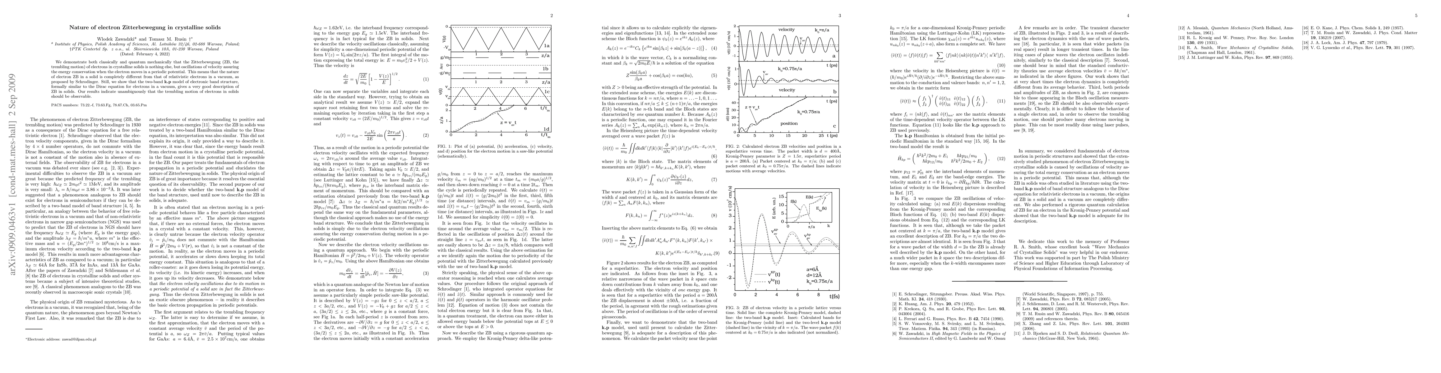 This paper demonstrates that electron Zitterbewegung in crystalline solids is an oscillation of velocity ensuring energy conservation in a periodic potential, differing from relativistic electrons in a vacuum. The two-band k.p model effectively describes this phenomenon, suggesting that the trembling motion of electrons in solids is observable.