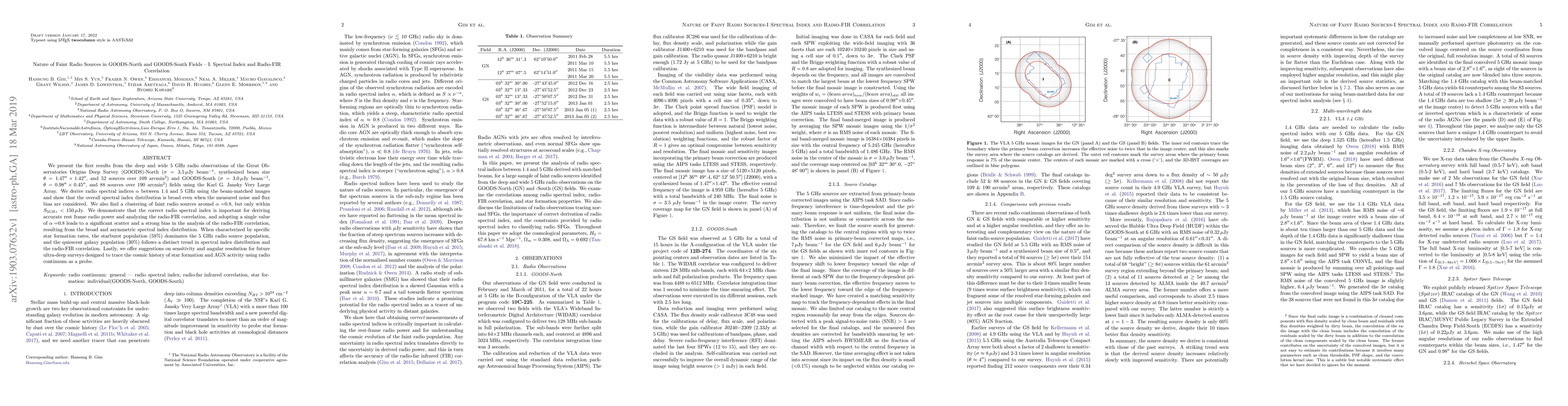 This study analyzes faint radio sources in the GOODS-North and GOODS-South fields using the Karl G. Jansky Very Large Array, finding a broad distribution of radio spectral indices and emphasizing the importance of accurate spectral index values for radio-FIR correlation analysis. The starburst population dominates the radio source population, while quiescent galaxies follow a distinct trend.