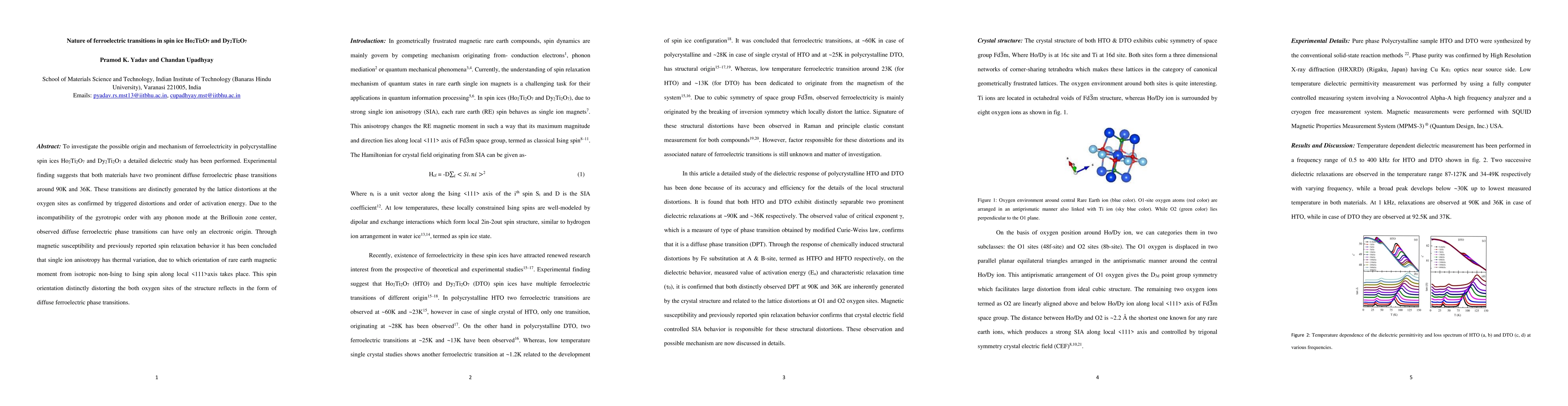 To investigate the possible origin and mechanism of ferroelectricity in polycrystalline spin ices Ho2Ti2O7 and Dy2Ti2O7 a detailed dielectric study has been performed. Experimental finding suggests that both materials have two prominent diffuse ferroelectric phase transitions around 90K and 36K. These transitions are distinctly generated by the lattice distortions at the oxygen sites as confirmed by triggered distortions and order of activation energy. Due to the incompatibility of the gyrotropic order with any phonon mode at the Brillouin zone center, observed diffuse ferroelectric phase transitions can have only an electronic origin. Through magnetic susceptibility and previously reported spin relaxation behavior it has been concluded that single ion anisotropy has thermal variation, due to which orientation of rare earth magnetic moment from isotropic non-Ising to Ising spin along local <111>axis takes place. This spin orientation distinctly distorting the both oxygen sites of the structure reflects in the form of diffuse ferroelectric phase transitions.