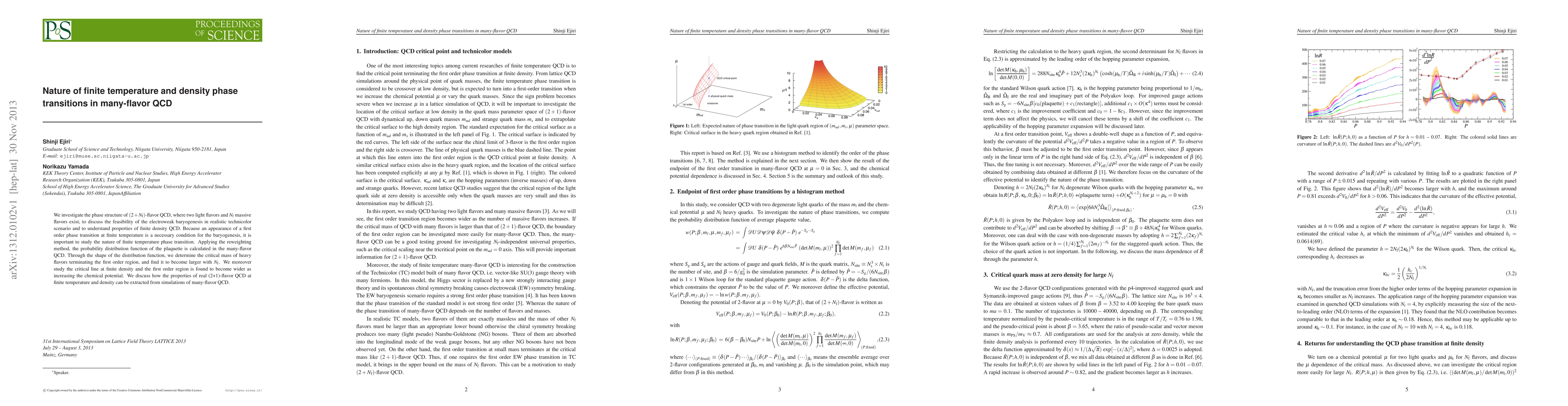 We investigate the phase structure of (2+Nf)-flavor QCD, where two light flavors and Nf massive flavors exist, to discuss the feasibility of the electroweak baryogenesis in realistic technicolor scenario and to understand properties of finite density QCD. Because an appearance of a first order phase transition at finite temperature is a necessary condition for the baryogenesis, it is important to study the nature of finite temperature phase transition. Applying the reweighting method, the probability distribution function of the plaquette is calculated in the many-flavor QCD. Through the shape of the distribution function, we determine the critical mass of heavy flavors terminating the first order region, and find it to become larger with Nf. We moreover study the critical line at finite density and the first order region is found to become wider as increasing the chemical potential. We discuss how the properties of real (2+1)-flavor QCD at finite temperature and density can be extracted from simulations of many-flavor QCD.