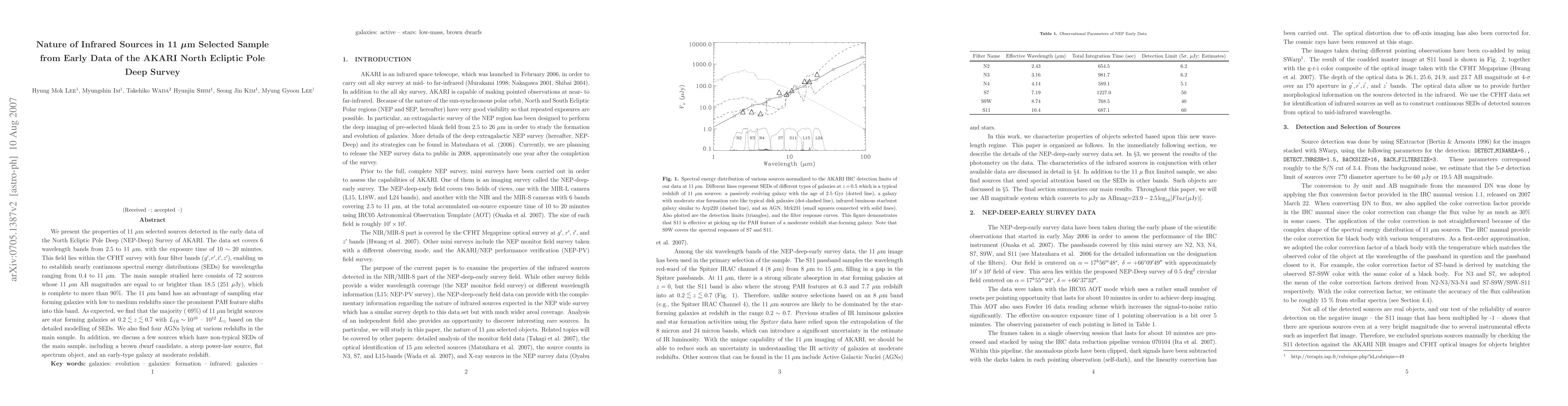 We present the properties of 11 $\mu$m selected sources detected in the early data of the North Ecliptic Pole Deep (NEP-Deep) Survey of AKARI. The data set covers 6 wavelength bands from 2.5 to 11 $\mu$m, with the exposure time of 10 ~ 20 minutes. This field lies within the CFHT survey with four filter bands ($g', r', i',z'), enabling us to establish nearly continuous spectral energy distributions (SEDs) for wavelengths ranging from 0.4 to 11 $\mu$m. The main sample studied here consists of 71 sources whose 11 $\mu$m AB magnitudes are equal to or brighter than 18.5 (251 $\mu$Jy), which is complete to more than 90%. The 11 $\mu$m band has an advantage of sampling star forming galaxies with low to medium redshifts since the prominent PAH feature shifts into this band. As expected, we find that the majority (~68%) of 11 $\mu$m bright sources are star forming galaxies at 0.2 < z < 0.7 with $L_{IR} ~ 10^{10}$ -- $10^{12} L_{\odot}$ based on the detailed modelling of SEDs. We also find four AGNs lying at various redshifts in the main sample. In addition, we discuss a few sources which have non-typical SEDs of the main sample, including a brown dwarf candidate, a steep power-law source, flat spectrum object, and an early-type galaxy at moderate redshift.