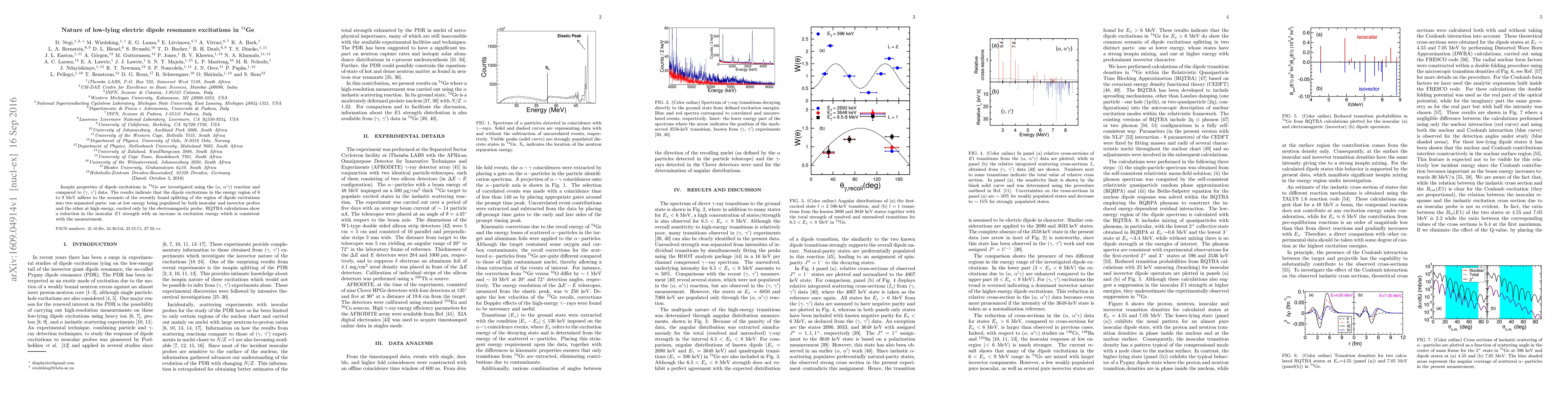 This paper investigates the isospin properties of dipole excitations in 74Ge using the (α,α'γ) reaction and compares the findings with (γ,γ) data. The study reveals a splitting of dipole excitations into two distinct regions, with the low-energy region populated by both isoscalar and isovector probes, and the high-energy region excited only by electromagnetic probes, consistent with RQTBA calculations.