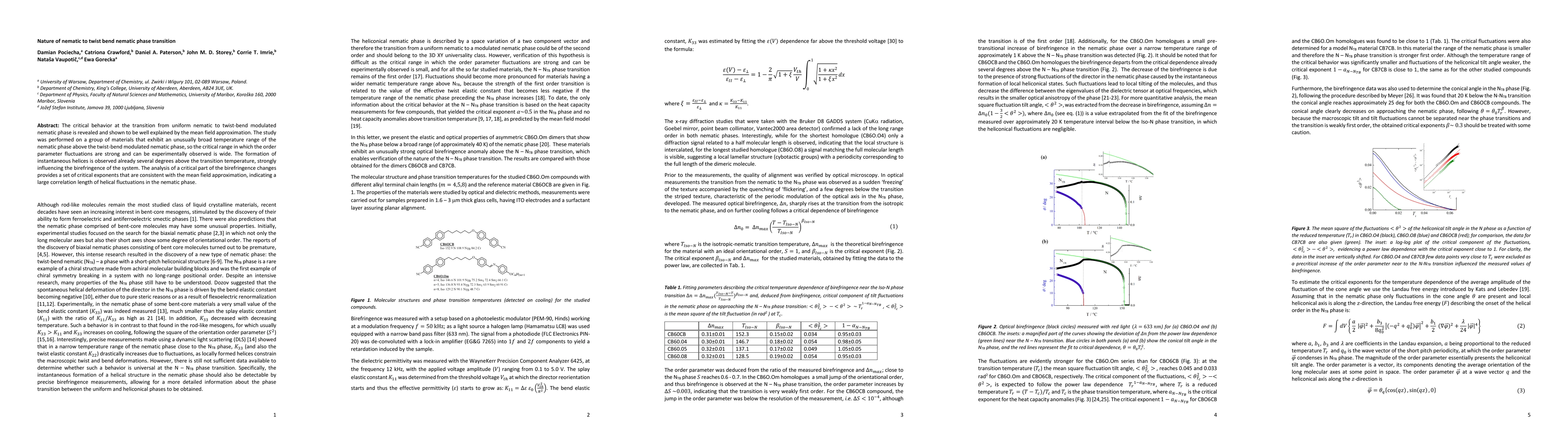 This study reveals the critical behavior of the nematic to twist-bend nematic phase transition, demonstrating that mean field approximation accurately describes the transition. The broad temperature range of the nematic phase allows for strong order parameter fluctuations, with helices forming above the transition temperature, influencing birefringence and supporting the mean field model's critical exponents.