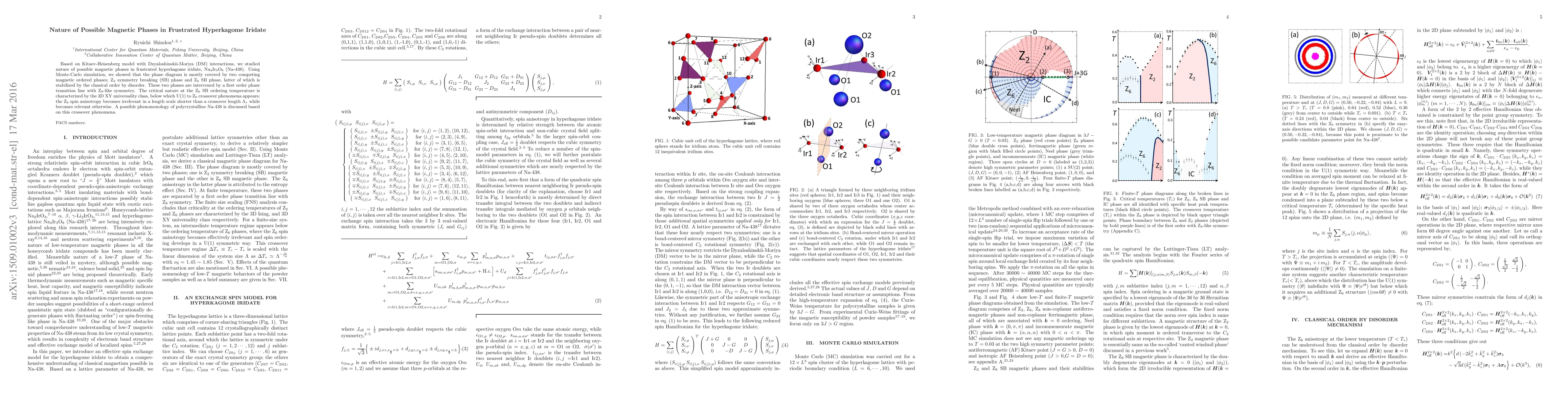 Based on Kitaev-Heisenberg model with Dzyaloshinskii-Moriya (DM) interactions, we studied nature of possible magnetic phases in frustrated hyperkagome iridate, Na$_4$Ir$_{3}$O$_8$ (Na-438). Using Monte-Carlo simulation, we showed that the phase diagram is mostly covered by two competing magnetic ordered phases; Z$_2$ symmetry breaking (SB) phase and Z$_6$ SB phase, latter of which is stabilized by the classical order by disorder. These two phases are separated by a first order phase transition line with Z$_8$-like symmetry. The critical nature at the Z$_6$ SB ordering temperature is characterized by the 3D XY universality class, below which U(1) to Z$_6$ crossover phenomena appears; the Z$_6$ spin anisotropy becomes irrelevant in a length scale shorter than a crossover length $\Lambda_*$ while becomes relevant otherwise. A possible phenomenology of polycrystalline Na-438 is discussed based on this crossover phenomena.