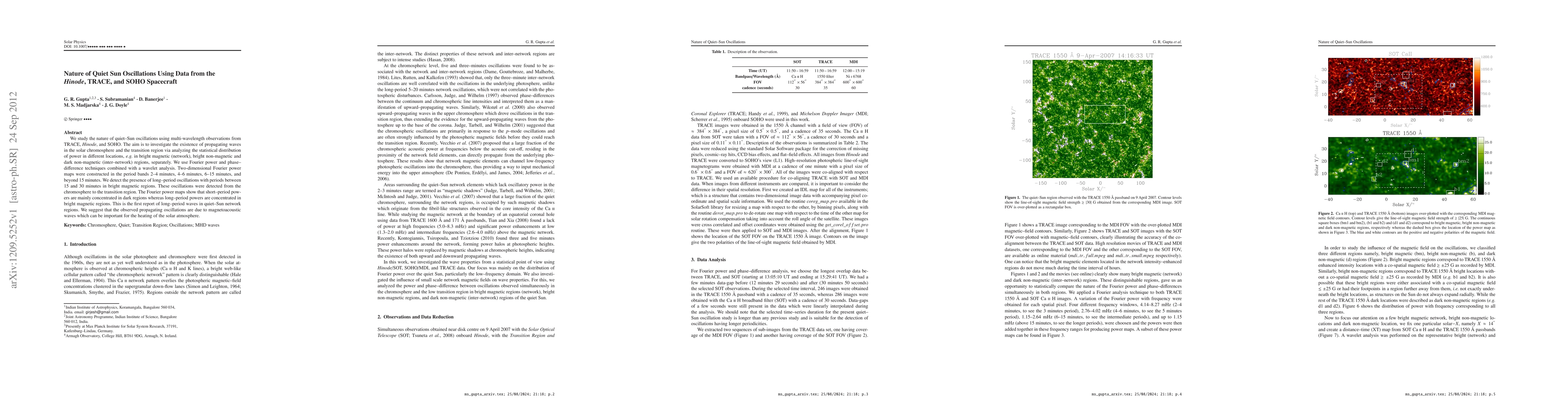 This study investigates quiet-Sun oscillations using multi-wavelength data from TRACE, Hinode, and SOHO, revealing long-period oscillations (15-30 minutes) in bright magnetic regions, suggesting magnetoacoustic waves that may contribute to solar atmosphere heating.