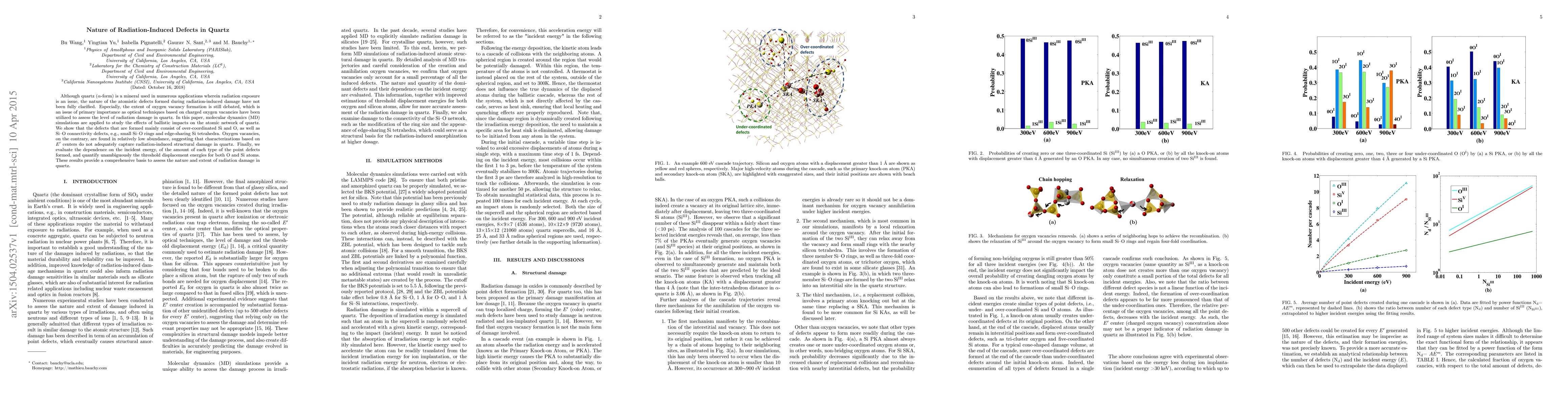 Researchers used molecular dynamics simulations to study radiation-induced defects in quartz, finding that oxygen vacancies are less common than previously thought, with over-coordinated silicon and Si-O connectivity defects dominating the damage pattern.