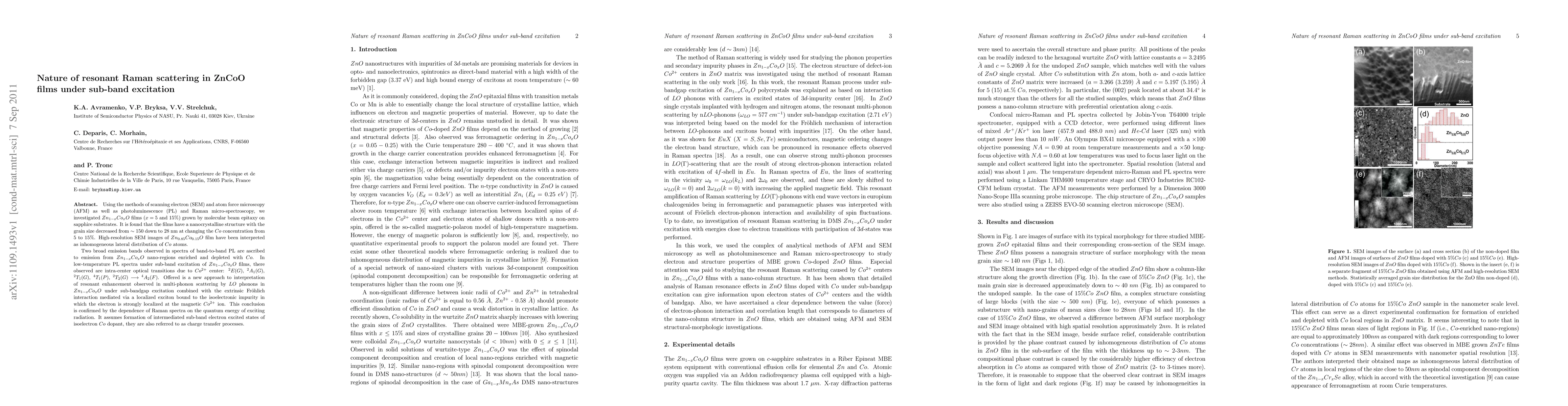 Using the methods of scanning electron (SEM) and atom force microscopy (AFM) as well as photoluminescence (PL) and Raman micro-spectroscopy, we investigated $Zn_{1-x}Co_xO$ films ($x=5$ and $15\%$) grown by molecular beam epitaxy on sapphire substrates. It is found that the films have a nanocrystalline structure with the grain size decreased from $\sim150$ down to $28$ nm at changing the $Co$ concentration from $5$ to $15\%$. High-resolution SEM images of $Zn_{0.85}Co_{0.15}O$ film have been interpreted as inhomogeneous lateral distribution of $Co$ atoms. Two broad emission bands observed in spectra of band-to-band PL are ascribed to emission from $Zn_{1-x}Co_xO$ nano-regions enriched and depleted with $Co$. In low-temperature PL spectra under sub-band excitation of $Zn_{1-x}Co_xO$ films, there observed are intra-center optical transitions due to $Co^{2+}$ center: $^2E(G)$, $^2A_1(G)$, $^2T_1(G)$, $^4T_1(P)$, $^2T_2(G)$ $\longrightarrow$ $^4A_2(F)$. Offered is a new approach to interpretation of resonant enhancement observed in multi-phonon scattering by $LO$ phonons in $Zn_{1-x}Co_xO$ under sub-bandgap excitation combined with the extrinsic Fr\"{o}hlich interaction mediated via a localized exciton bound to the isoelectronic impurity in which the electron is strongly localized at the magnetic $Co^{2+}$ ion. This conclusion is confirmed by the dependence of Raman spectra on the quantum energy of exciting radiation. It assumes formation of intermediated sub-band electron excited states of isoelectron $Co$ dopant, they are also referred to as charge transfer processes.