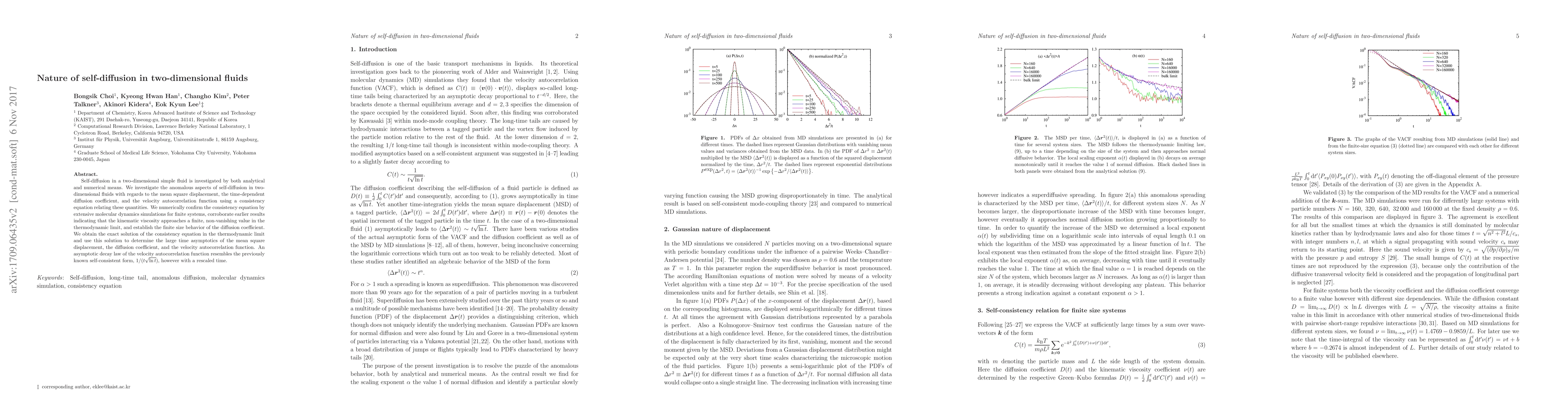 Research investigates self-diffusion in 2D fluids using analytical and numerical methods, finding an anomalous behavior that approaches a finite value as the system size increases.
