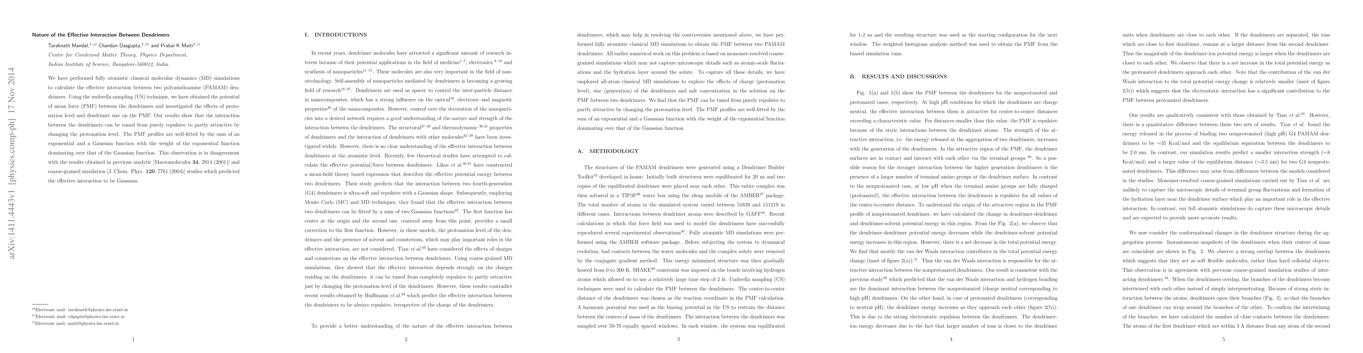 This study uses molecular dynamics simulations to analyze the interaction between polyamidoamine dendrimers. It finds that this interaction, initially repulsive, can become partially attractive by adjusting the dendrimer protonation level. This contradicts previous predictions of a purely Gaussian interaction.