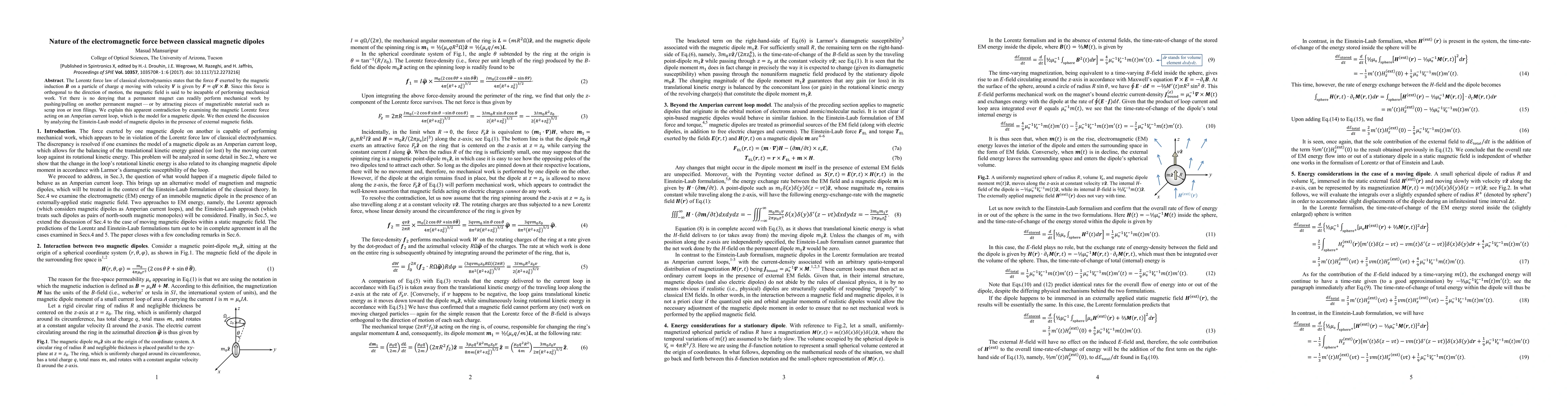 This research clarifies the apparent contradiction between the Lorentz force law and the observable mechanical work performed by magnets, providing insights into the behavior of magnetic dipoles in classical electrodynamics.