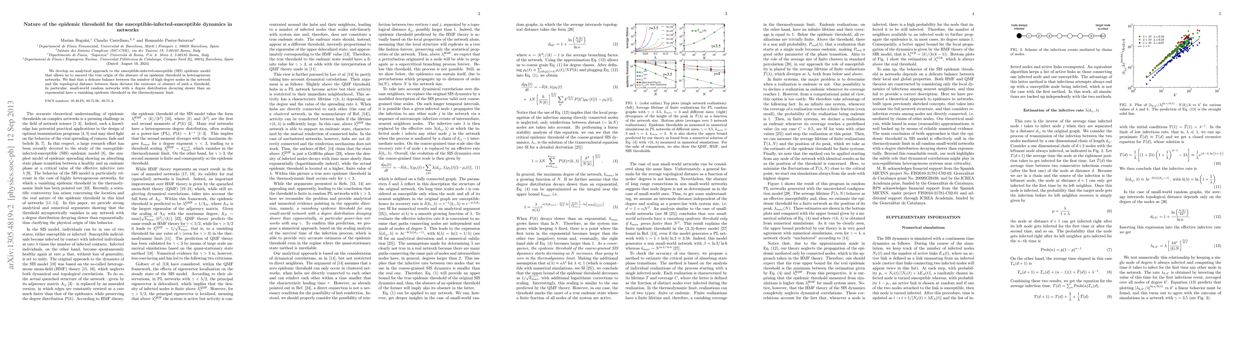 This paper analytically explores the SIS epidemic model in networks, finding that the absence of an epidemic threshold in heterogeneous networks is due to the balance between high-degree nodes and their topological distances, with small-world networks having a threshold that vanishes in large sizes.