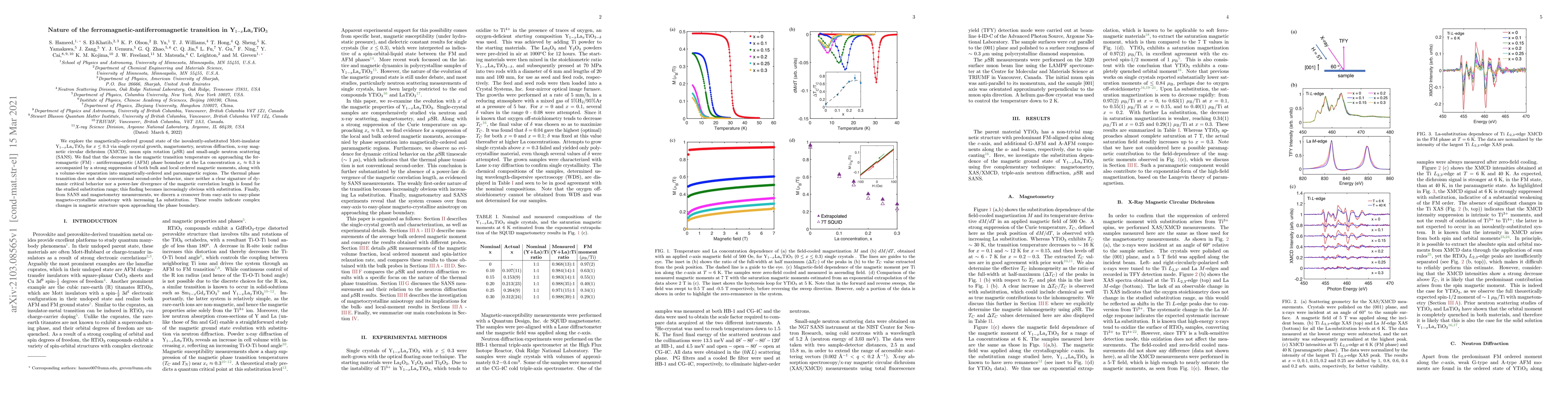 We explore the magnetically-ordered ground state of the isovalently-substituted Mott-insulator Y$_{1-x}$La$_{x}$TiO$_{3}$ for $x$ $\leq$ 0.3 via single crystal growth, magnetometry, neutron diffraction, x-ray magnetic circular dichroism (XMCD), muon spin rotation ($\mu$SR) and small-angle neutron scattering (SANS). We find that the decrease in the magnetic transition temperature on approaching the ferromagnetic (FM) - antiferromagnetic (AFM) phase boundary at the La concentration $x_c$ $\approx$ 0.3 is accompanied by a strong suppression of both bulk and local ordered magnetic moments, along with a volume-wise separation into magnetically-ordered and paramagnetic regions. The thermal phase transition does not show conventional second-order behavior, since neither a clear signature of dynamic critical behavior nor a power-law divergence of the magnetic correlation length is found for the studied substitution range; this finding becomes increasingly obvious with substitution. Finally, from SANS and magnetometry measurements, we discern a crossover from easy-axis to easy-plane magneto-crystalline anisotropy with increasing La substitution. These results indicate complex changes in magnetic structure upon approaching the phase boundary.