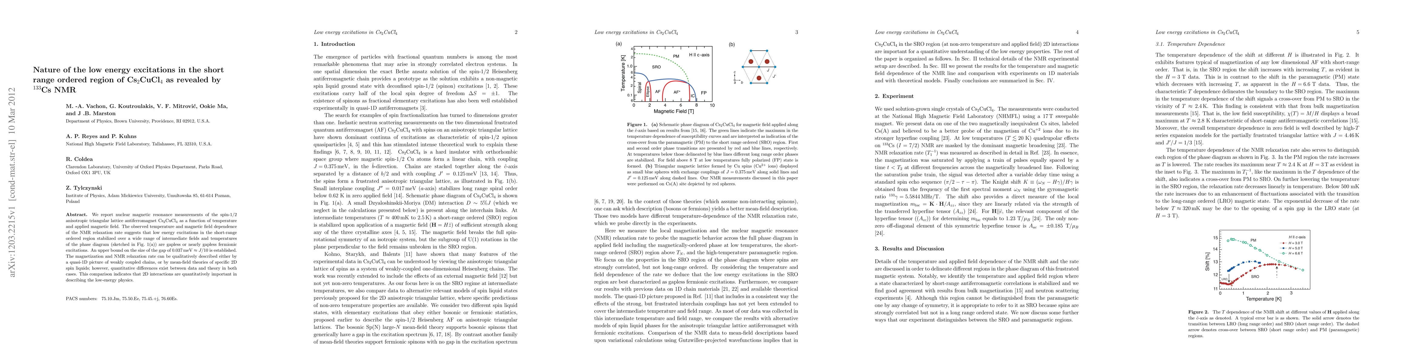 Researchers used $^{133}$Cs NMR to study the low-energy excitations in Cs$_2$CuCl$_4$, finding that they are gapless or nearly gapless fermionic excitations with an upper bound of 0.037 meV. This suggests that 2D interactions play a crucial role in describing the low-energy physics.