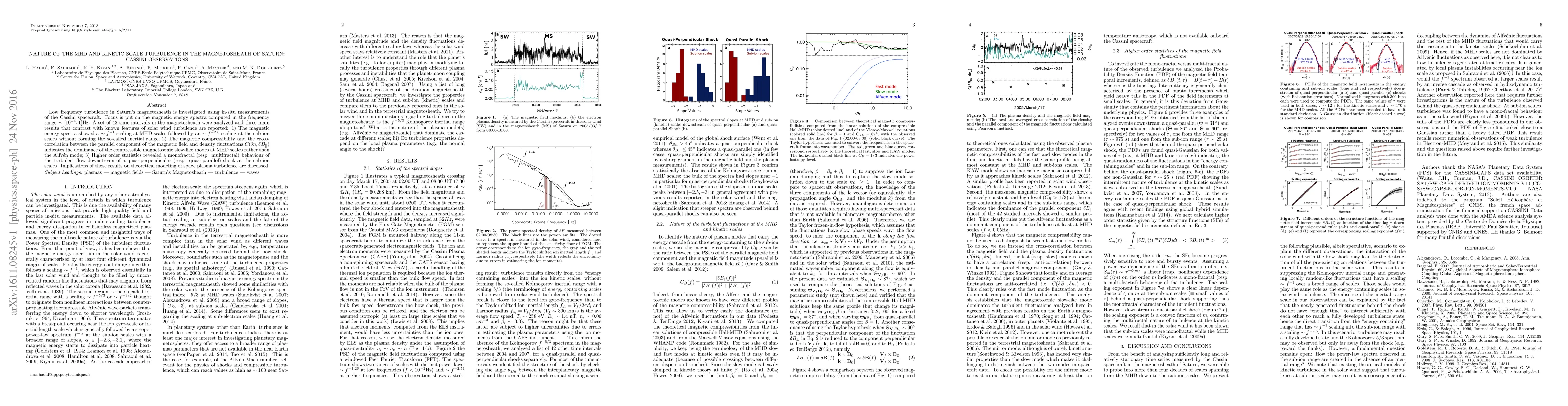 This study investigates low-frequency turbulence in Saturn's magnetosheath using Cassini spacecraft data, revealing a $f^{-1}$ scaling in magnetic energy spectra at MHD scales and a $f^{-2.6}$ scaling at sub-ion scales, contrasting with solar wind turbulence. The analysis highlights the dominance of magnetosonic slow-like modes over Alfvén modes and different fractal behaviors downstream of different shock types.