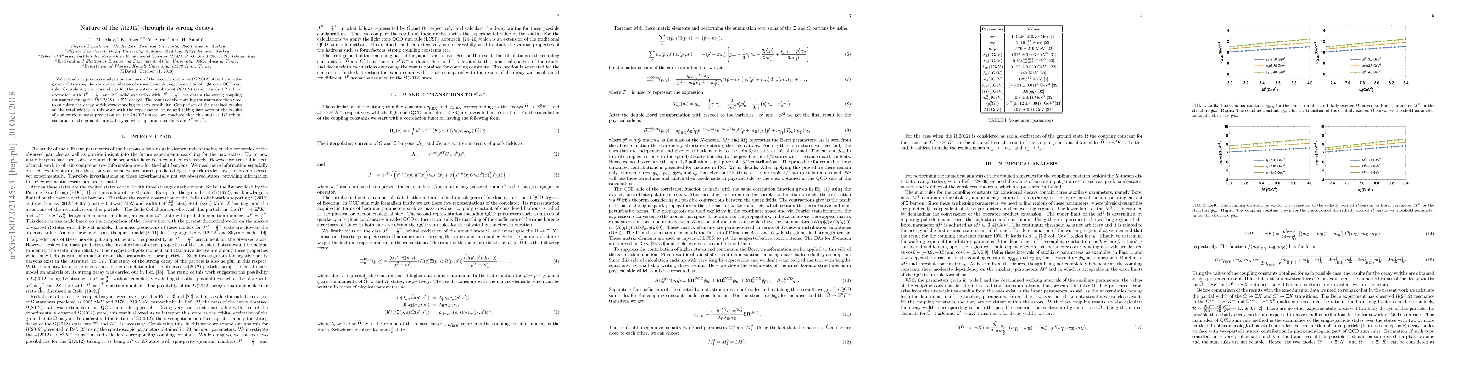 This paper investigates the nature of the $\Omega(2012)$ state through its strong decays, using the light cone QCD sum rule method. It concludes that the $\Omega(2012)$ is a $1P$ orbital excitation of the ground state $\Omega$ baryon with quantum numbers $J^P=\frac{3}{2}^-$, based on the comparison of calculated decay widths with experimental values.