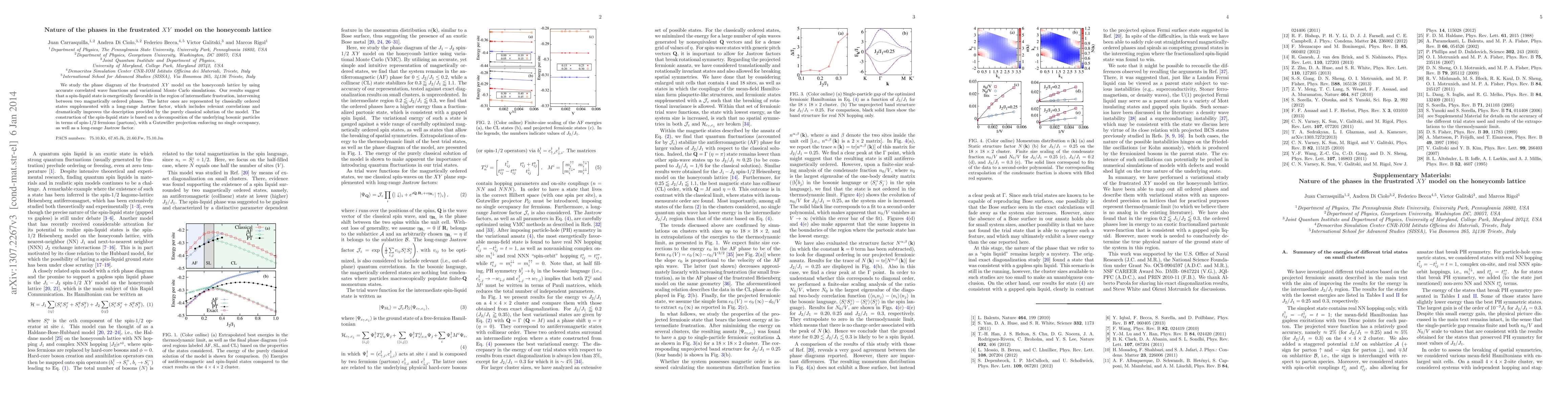 This study investigates the phase diagram of the frustrated XY model on a honeycomb lattice, revealing a spin-liquid state between two magnetically ordered phases. The ordered phases are enhanced by a long-range Jastrow factor, while the spin-liquid state is constructed using spin-1/2 fermions and a Gutzwiller projection.