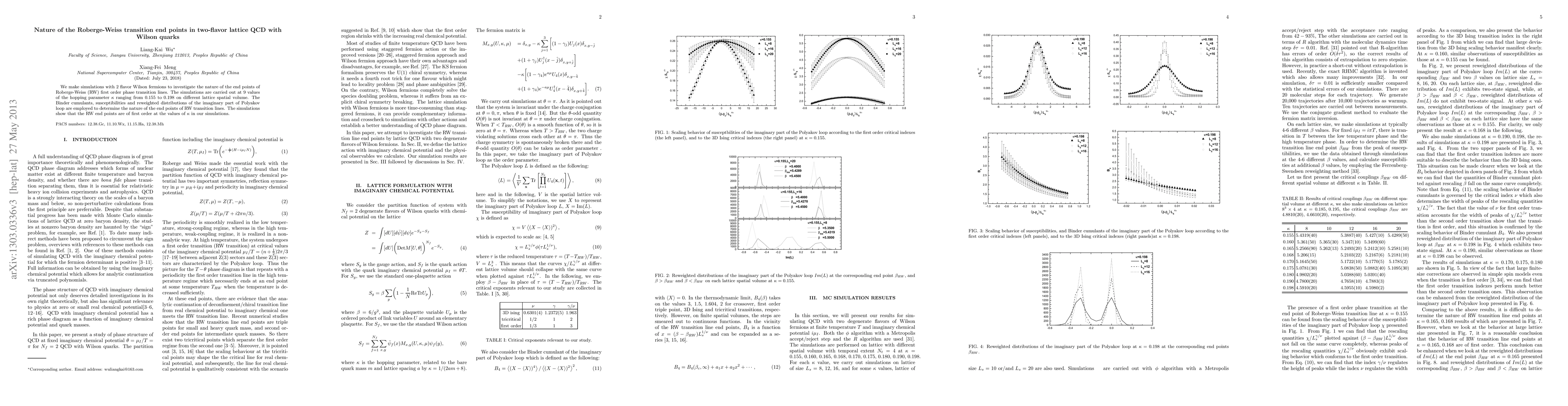 We make simulations with 2 flavor Wilson fermions to investigate the nature of the end points of Roberge-Weiss (RW) first order phase transition lines. The simulations are carried out at 9 values of the hopping parameter $\kappa$ ranging from 0.155 to 0.198 on different lattice spatial volume. The Binder cumulants, susceptibilities and reweighted distributions of the imaginary part of Polyakov loop are employed to determine the nature of the end points of RW transition lines. The simulations show that the RW end points are of first order at the values of $\kappa$ in our simulations.