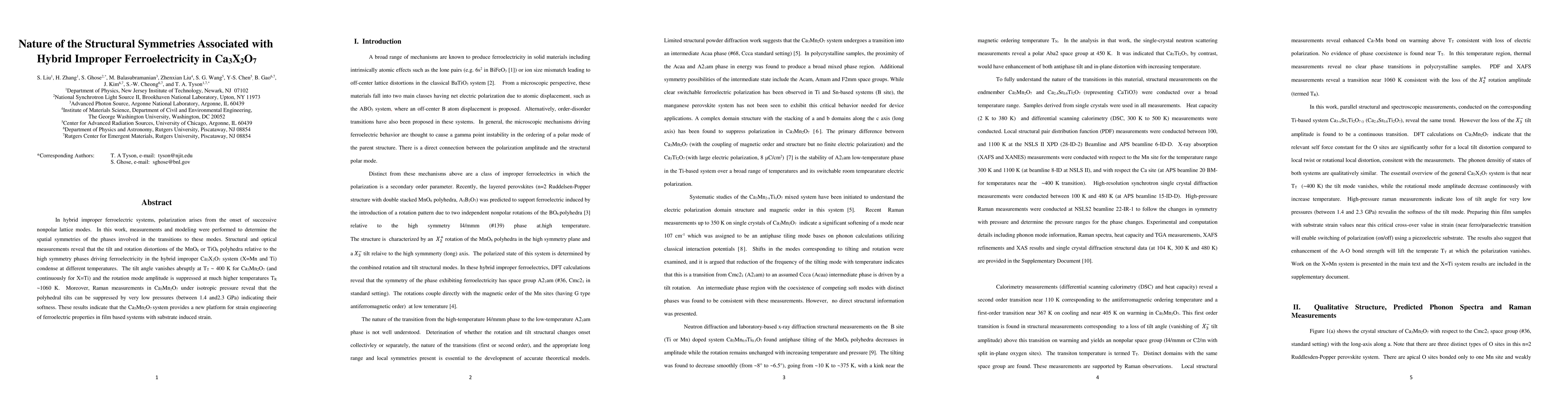 This study investigates the structural symmetries associated with hybrid improper ferroelectricity in Ca3X2O7 (X=Mn, Ti) systems, revealing that tilt and rotation distortions of MnO6 or TiO6 polyhedra condense at different temperatures, with Ca3Mn2O7 showing abrupt tilt suppression at ~400 K and continuous suppression for Ca3TiO7. Pressure experiments show that polyhedral tilts can be suppressed by low pressures, suggesting potential for strain engineering in ferroelectric films.