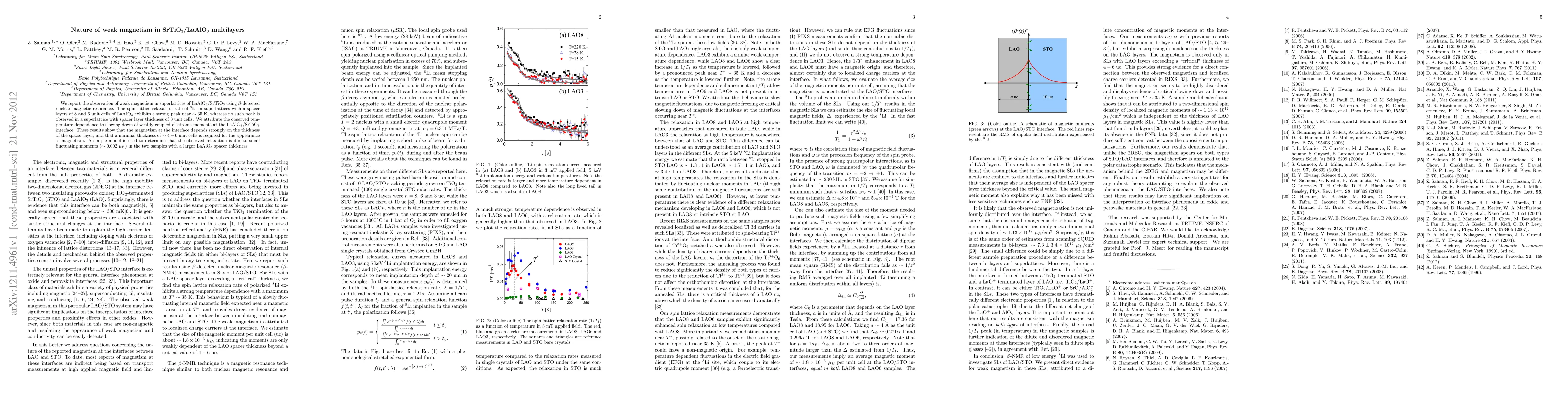 This study observes weak magnetism in SrTiO3/LaAlO3 superlattices using beta-detected nuclear magnetic resonance, revealing that a spacer layer thickness of 4-6 unit cells of LaAlO3 is needed for magnetism to appear, likely due to fluctuating electronic moments at the interface.