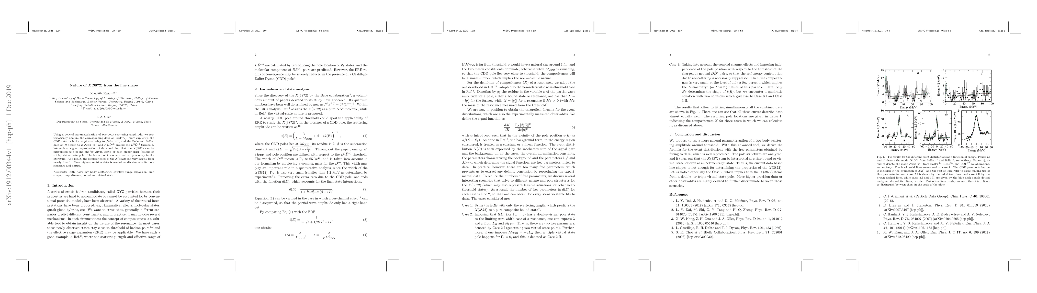 Using a general parameterization of two-body scattering amplitude, we systematically analyze the corresponding data on $X(3872)$, more explicitly, the CDF data on inclusive $p\bar{p}$ scattering to $J/\psi \pi^+\pi^-$, and the Belle and BaBar data on $B$ decays to $K\, J/\psi \pi^+\pi^-$ and $K D\bar{D}^{*0}$ around the $D^0\bar{D}^{*0}$ threshold. We achieve a good reproduction of data and find that the $X(3872)$ can be interpreted as a bound and/or virtual state, or even higher-order (double or triple) virtual sate pole. The latter point was not realized previously in the literature. % The latter point has not been realized in other literatures. As a result, the compositeness of the $X(3872)$ can vary largely from nearly 0 to 1. More higher-precision data is needed to discriminate its pole structure and nature.