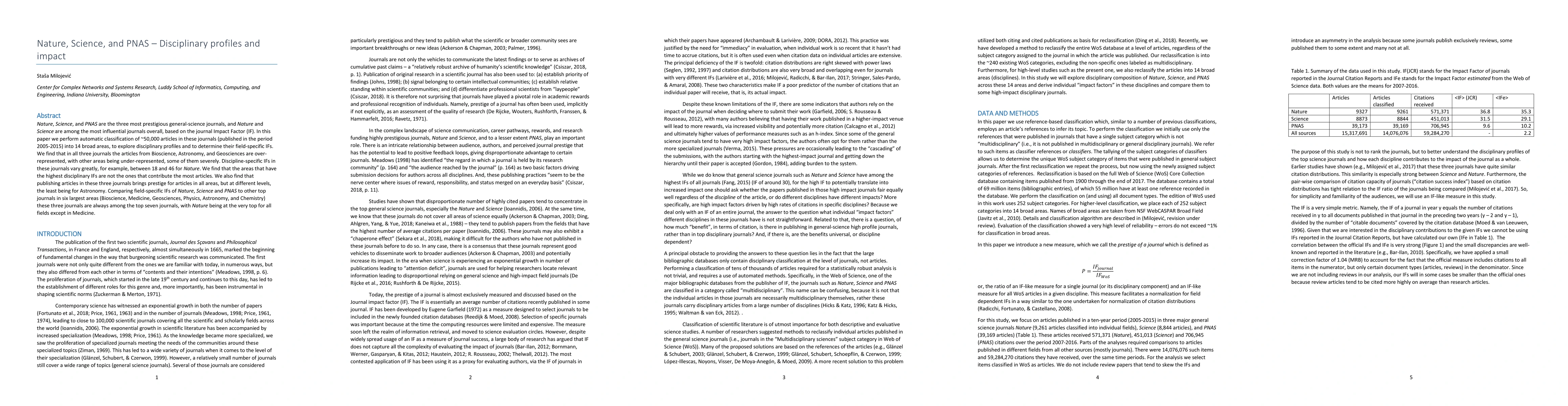 This paper classifies ~50,000 articles from Nature, Science, and PNAS into 14 disciplines to analyze their profiles and field-specific Impact Factors (IF), revealing Bioscience, Astronomy, and Geosciences as over-represented and others under-represented. The study finds that prestigious journals maintain high IFs across disciplines but do not necessarily correlate with article contribution levels.