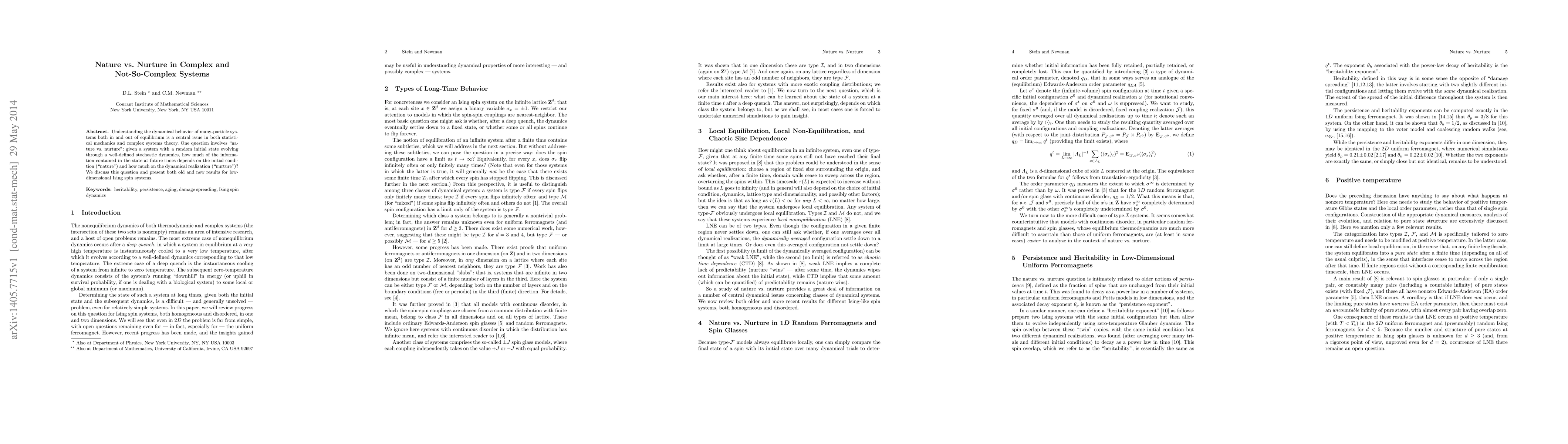 This paper explores the "nature versus nurture" debate in many-particle systems, examining how initial conditions versus stochastic dynamics influence the future state of systems in statistical mechanics and complex systems theory, with a focus on low-dimensional Ising spin systems. It presents both historical and novel findings.