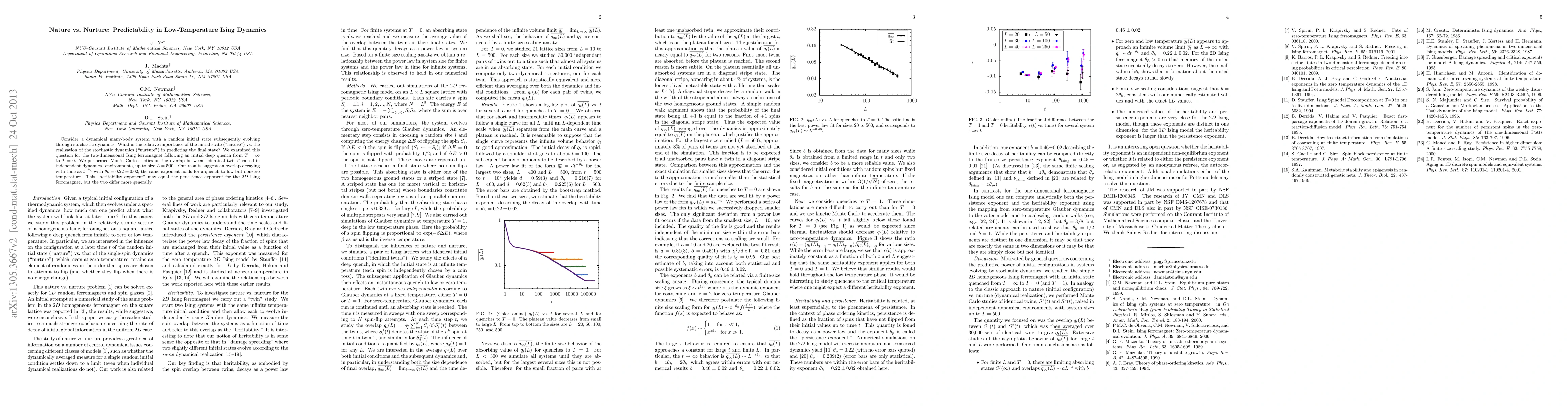 Consider a dynamical many-body system with a random initial state subsequently evolving through stochastic dynamics. What is the relative importance of the initial state ("nature") vs. the realization of the stochastic dynamics ("nurture") in predicting the final state? We examined this question for the two-dimensional Ising ferromagnet following an initial deep quench from $T=\infty$ to $T=0$. We performed Monte Carlo studies on the overlap between "identical twins" raised in independent dynamical environments, up to size $L=500$. Our results suggest an overlap decaying with time as $t^{-\theta_h}$ with $\theta_h = 0.22 \pm 0.02$; the same exponent holds for a quench to low but nonzero temperature. This "heritability exponent" may equal the persistence exponent for the 2D Ising ferromagnet, but the two differ more generally.