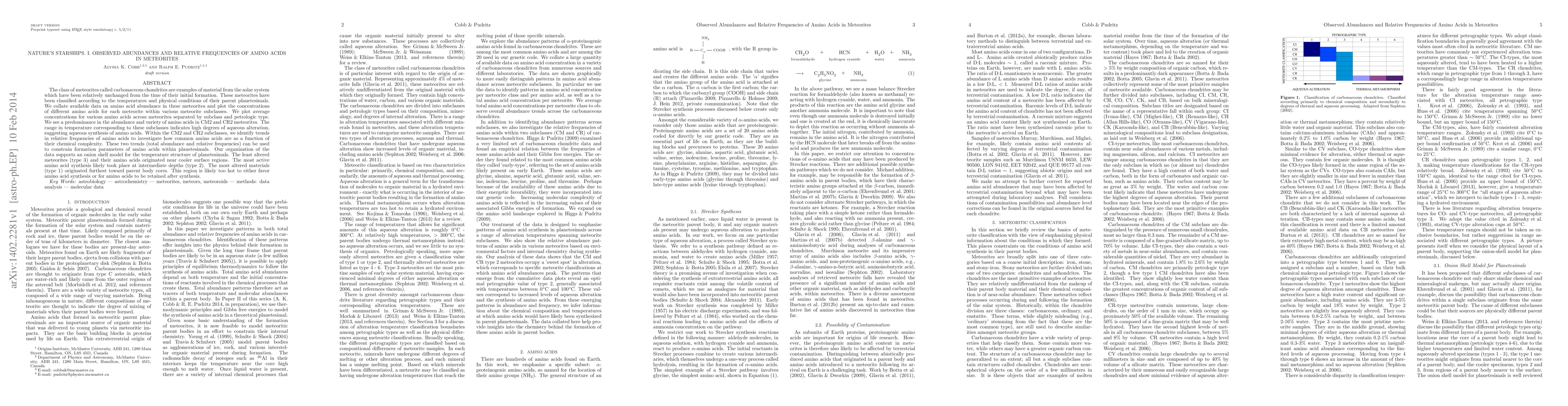 This study collates data on amino acid abundances in carbonaceous chondrite meteorites, revealing a higher concentration and variety in CM2 and CR2 types, suggesting aqueous synthesis. The analysis supports an onion shell model for planetesimal temperature structure, indicating amino acid synthesis occurred at intermediate depths.
