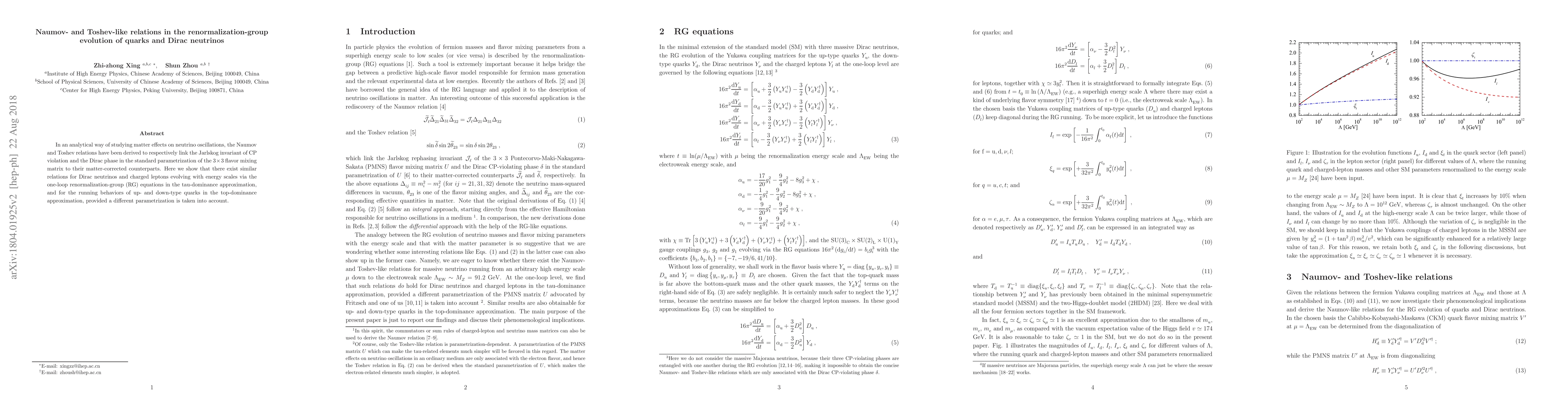 This paper derives Naumov- and Toshev-like relations for the renormalization-group evolution of quarks and Dirac neutrinos, showing analogous connections between matter-corrected and standard parametrizations in the context of CP violation and flavor mixing. These relations are established under specific dominance approximations for leptons and quarks.
