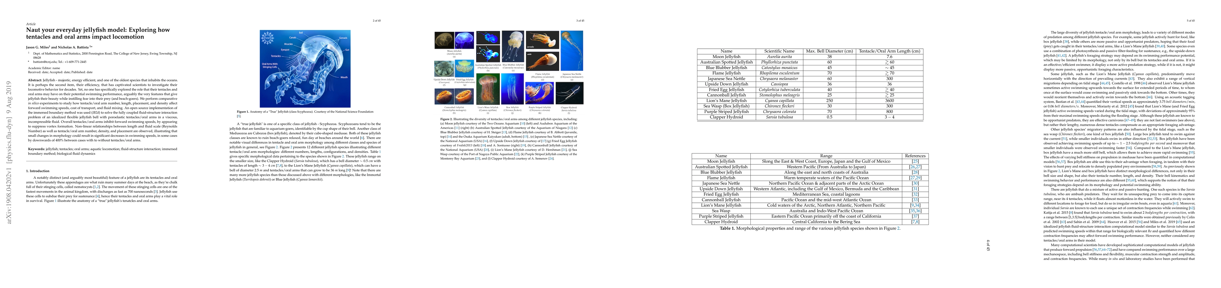 This study investigates how jellyfish tentacles and oral arms influence their swimming performance using in silico experiments. Results show that tentacles/oral arms inhibit forward swimming speeds by suppressing vortex formation, with significant decreases in speed observed due to changes in morphology.