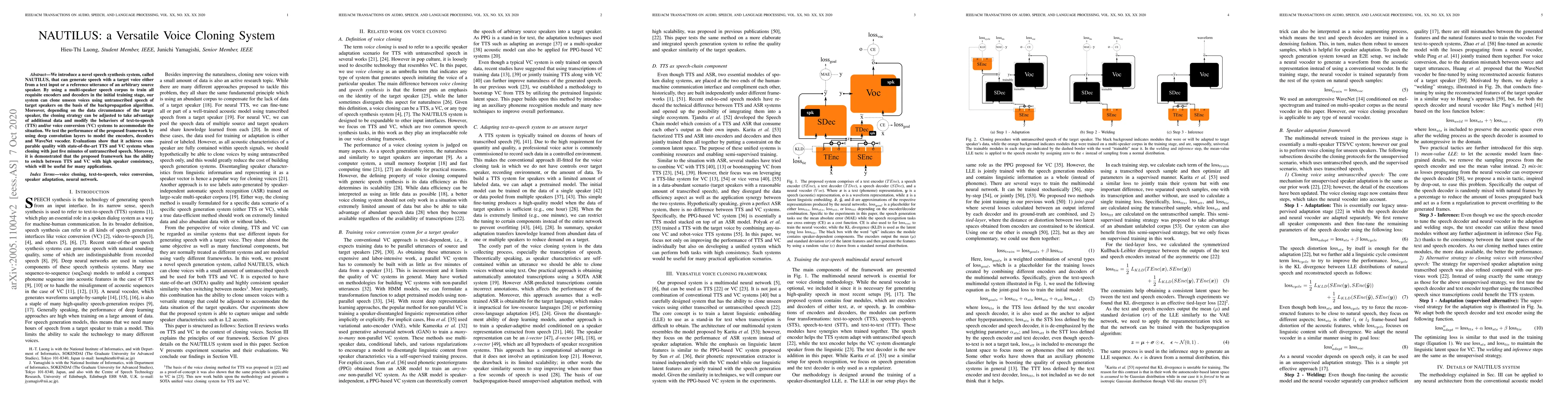 NAUTILUS is a versatile voice cloning system that can generate speech from text or reference samples, utilizing a multi-speaker training approach. It achieves high-quality voice cloning with minimal input data and can switch between text-to-speech and voice conversion modes effectively.
