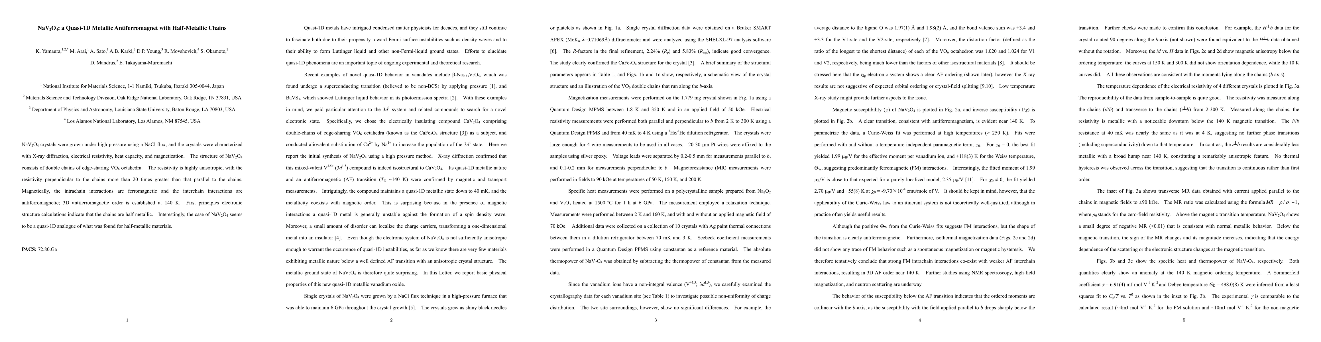 NaV2O4 crystals were grown under high pressure using a NaCl flux, and the crystals were characterized with X-ray diffraction, electrical resistivity, heat capacity, and magnetization. The structure of NaV2O4 consists of double chains of edge-sharing VO6 octahedra. The resistivity is highly anisotropic, with the resistivity perpendicular to the chains more than 20 times greater than that parallel to the chains. Magnetically, the intrachain interactions are ferromagnetic and the interchain interactions are antiferromagnetic; 3D antiferromagnetic order is established at 140 K. First principles electronic structure calculations indicate that the chains are half metallic. Interestingly, the case of NaV2O4 seems to be a quasi-1D analogue of what was found for half-metallic materials.