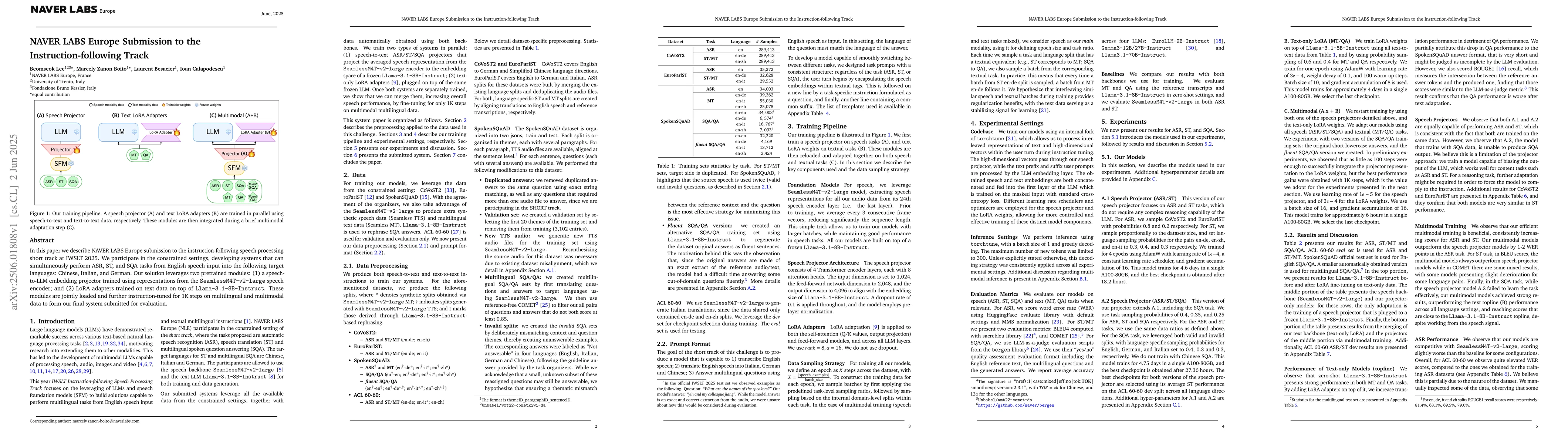 In this paper we describe NAVER LABS Europe submission to the instruction-following speech processing short track at IWSLT 2025. We participate in the constrained settings, developing systems that can simultaneously perform ASR, ST, and SQA tasks from English speech input into the following target languages: Chinese, Italian, and German. Our solution leverages two pretrained modules: (1) a speech-to-LLM embedding projector trained using representations from the SeamlessM4T-v2-large speech encoder; and (2) LoRA adapters trained on text data on top of a Llama-3.1-8B-Instruct. These modules are jointly loaded and further instruction-tuned for 1K steps on multilingual and multimodal data to form our final system submitted for evaluation.