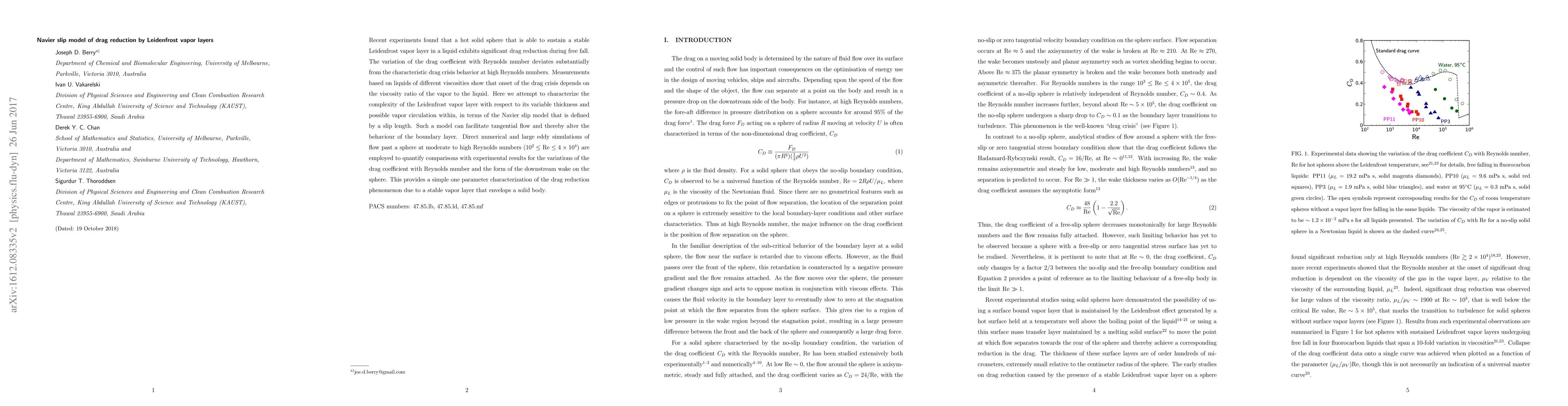 Recent experiments found that a hot solid sphere that is able to sustain a stable Leidenfrost vapour layer in a liquid exhibits significant drag reduction during free fall. The variation of the drag coefficient with Reynolds number shows substantial deviation from the characteristic drag crisis behavior at high Reynolds numbers. Results obtained with liqiuds of different viscosities show that onset of the drag crisis depends on the viscosity ratio of the vapor to the liquid. The key feature of the vapour layer in facilitating tangential flow and in altering the behaviour of the boundary layer can be captured by the Navier slip model that is defined by a slip length. Here, direct numerical and large eddy simulations of flow past a sphere at moderate to high Reynolds numbers ($10^2 \leq \mbox{Re} \leq 4 \times 10^4$) are employed to quantify comparisons with experimental results in terms of variations of the drag coefficient with Reynolds number and the form of the downstream wake on the sphere. This provides a simple one parameter characterization of the drag reduction phenomenon.